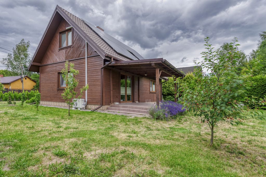 Dom zbudowany z naturalnych materiałów (drewno, wełna mineralna), zaprojektowany z myślą o osobach ceniących zdrowy mikroklimat, bliskość przyrody i komfort mieszkania z dala od miejskiego zgiełku.