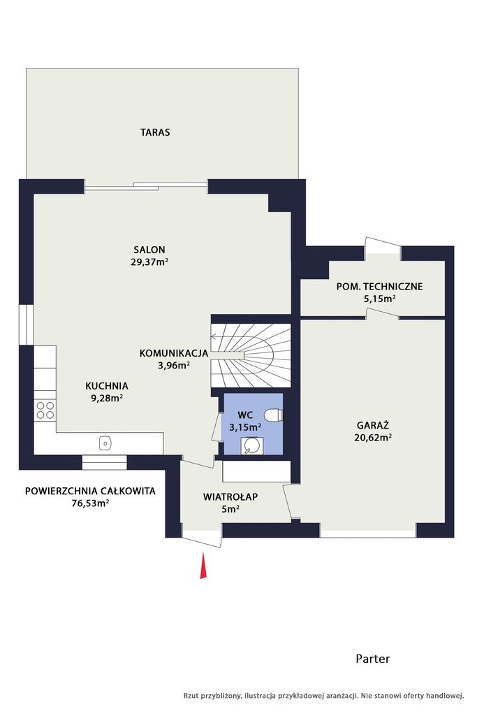 Na partnerze została wydzielona strefa dzienna, w której znajdziemy: salon z otwartą kuchnią, Wc, wiatrołapem, pomieszczeniem technicznym oraz garażem.