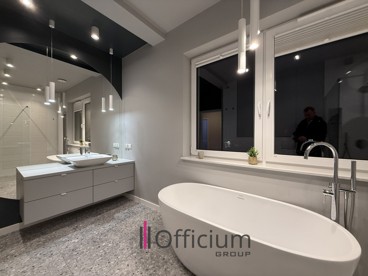 Łazienka dolna jak i górna zrobione w eleganckiej i nowoczesnej stylistyce.