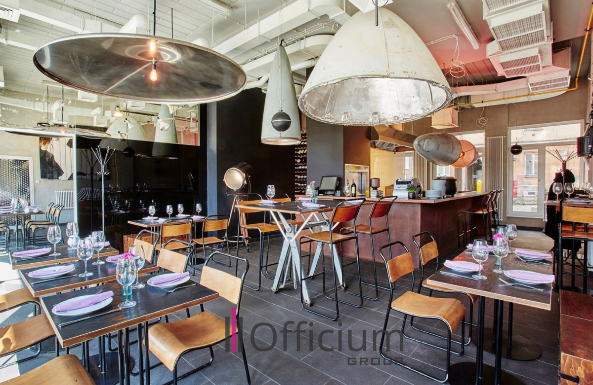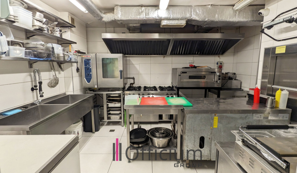 Lokal położony jest na dwóch kondygnacjach: poziom -1, ok. 45 mkw. (z kuchnią), oraz parter, ok. 62 mkw. Jest winda gastronomiczna.