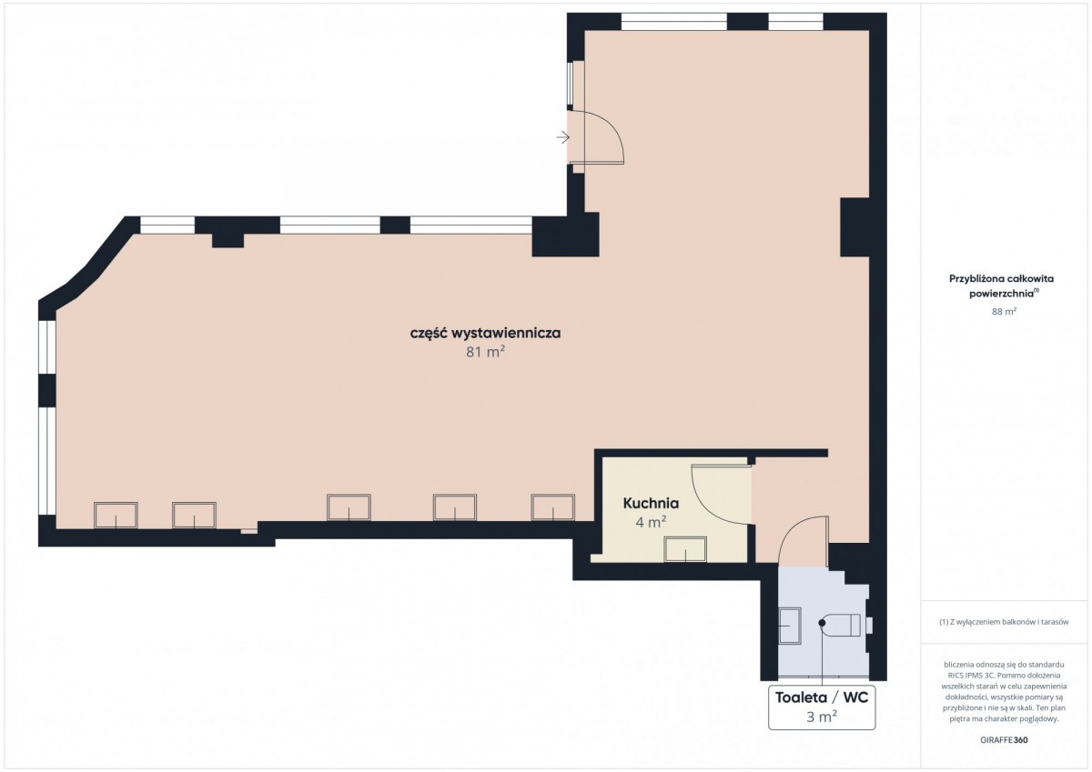 Obecna powierzchnia wystawiennicza: ok. 78 m² + zaplecze (kuchnia + WC + mały magazyn): ok. 10 m²