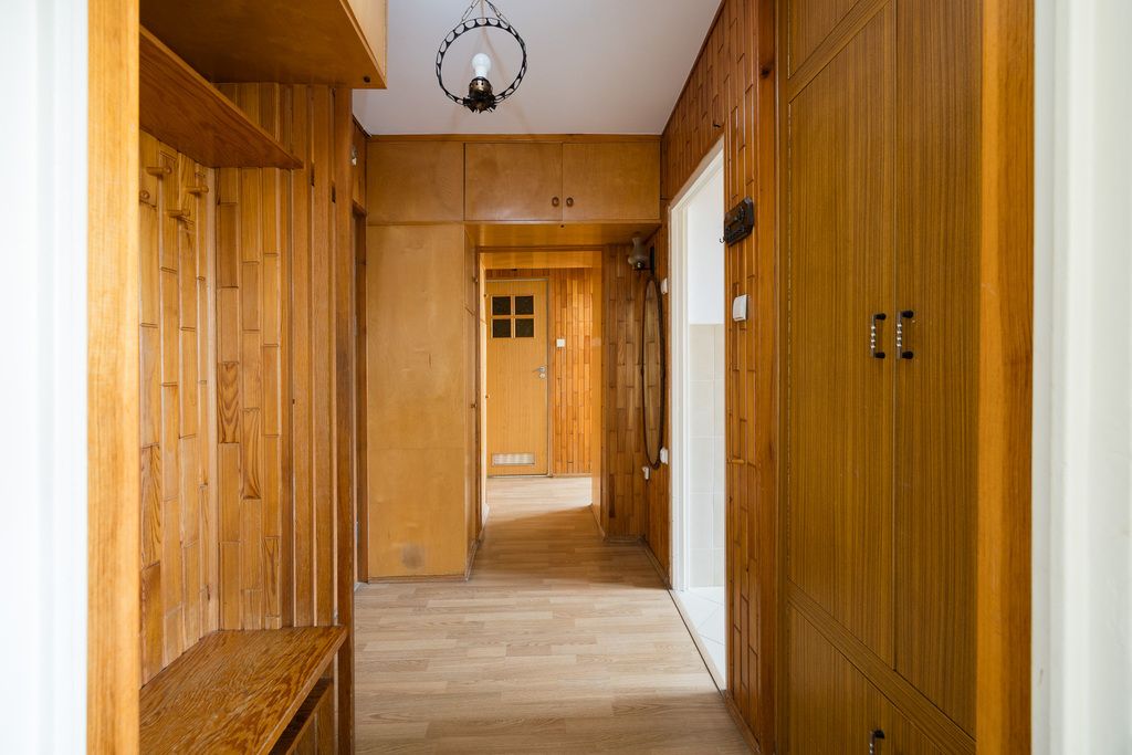 - W przedpokoju znajduje się drewniana boazeria — w dobrym stanie, może zostać odnowiona lub usunięta według uznania.