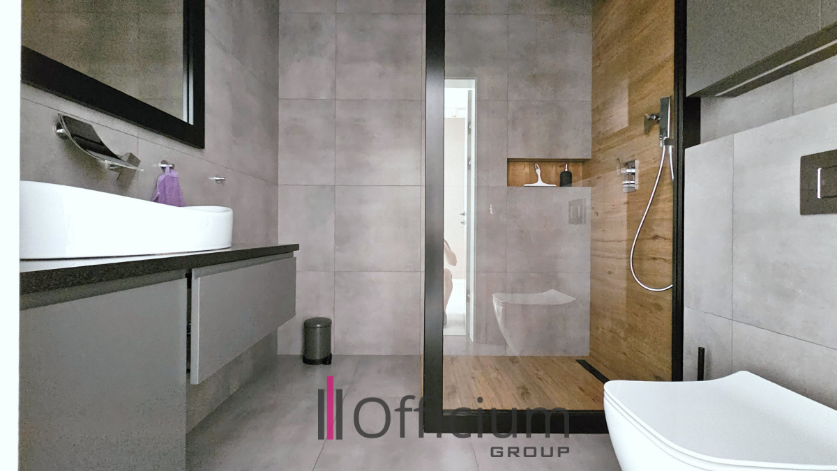 nowoczesna łazienka z ogrzewaniem podłogowym, deszczownicą i kaskadą wodną,