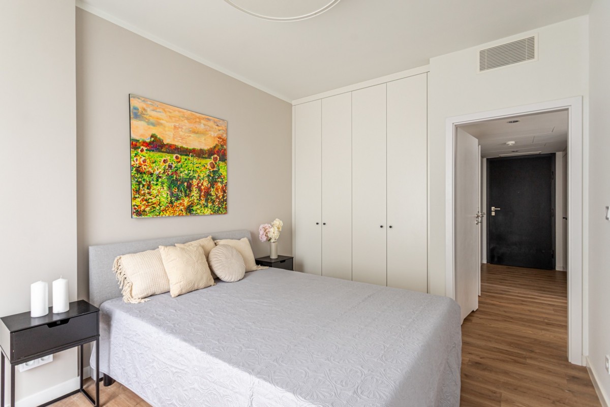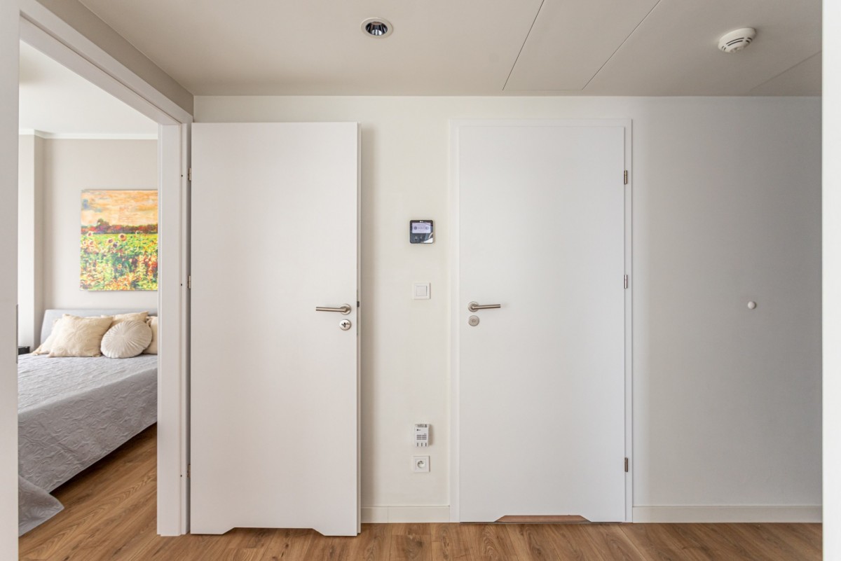 zostało w zabudowane szafy, dzięki czemu zapewnia dużo miejsca do przechowywania i jednocześnie zachowuje poczucie przestronności.