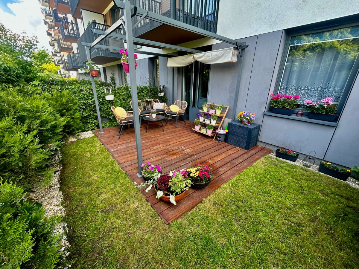 ogródek o powierzchni 31,41 m2 z drewnianym tarasem oraz pergolą.