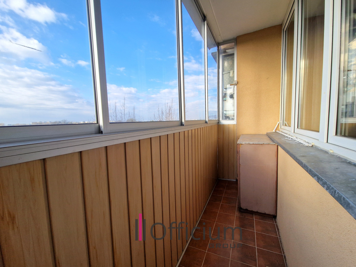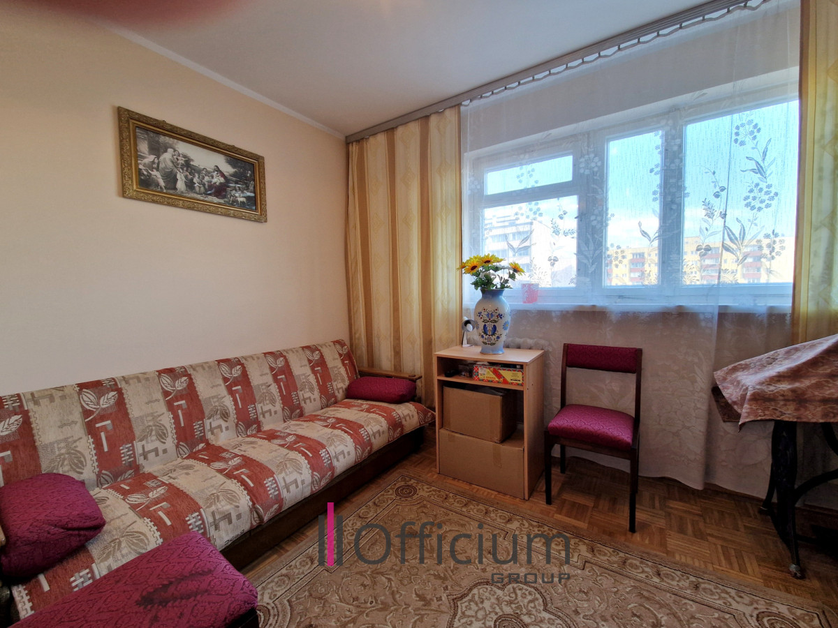 salon (ok. 16 m²) z wyjściem na balkon z panoramicznym widokiem na ogródki działkowe