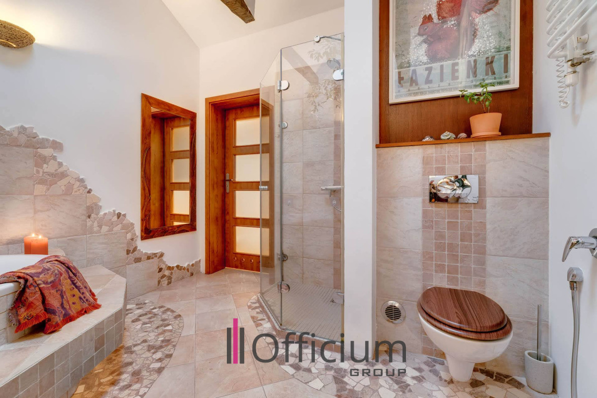 - wyjątkowa łazienka typu domowe SPA z wysokimi sufitami, roślinnością, dużą wanną i oknem dachowym,
