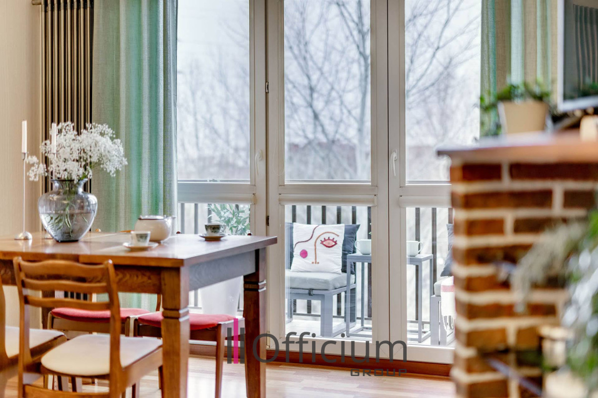 - salon z aneksem kuchennym i wyjściem na balkon z widokiem na tereny zielone, bez sąsiadów naprzeciwko,