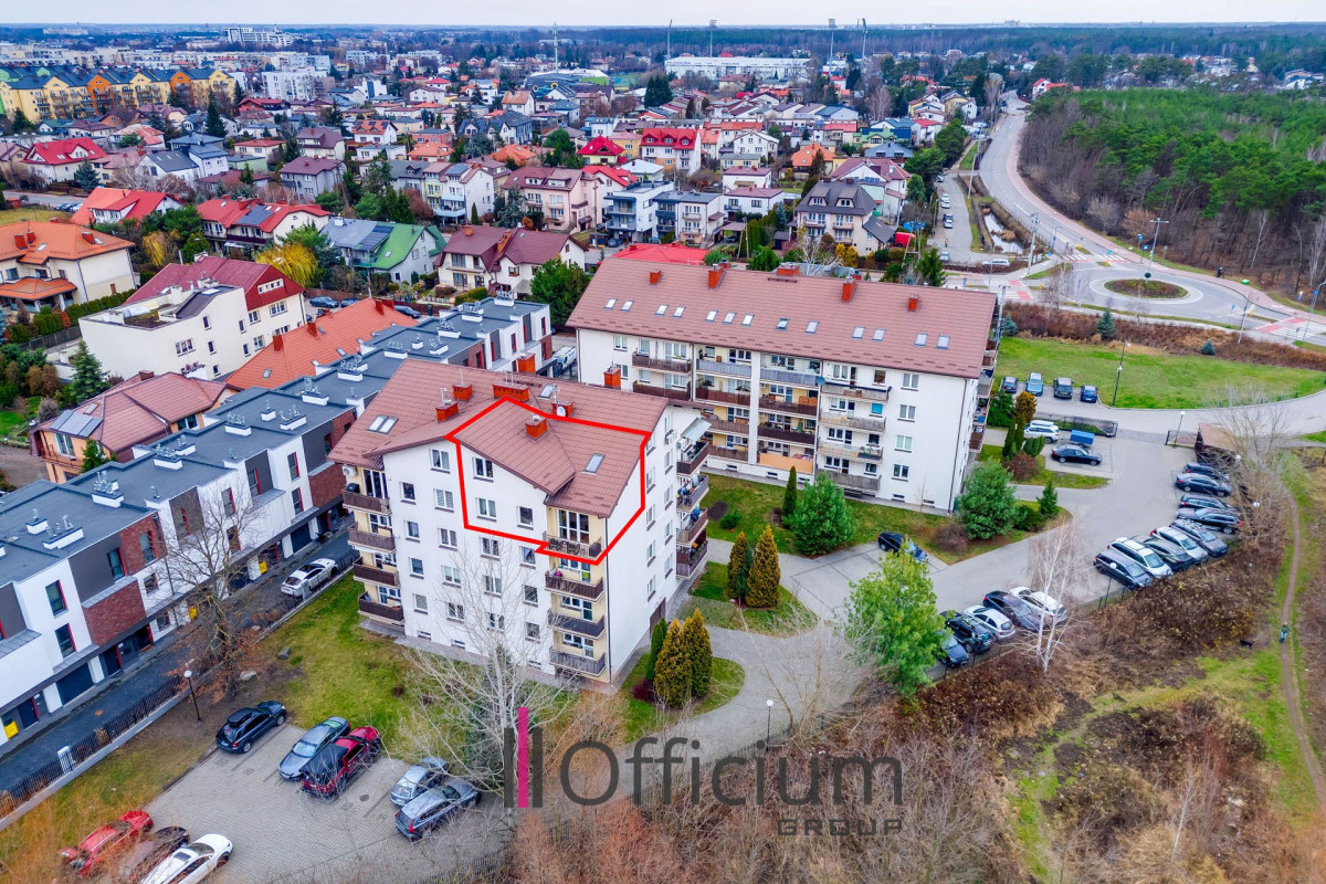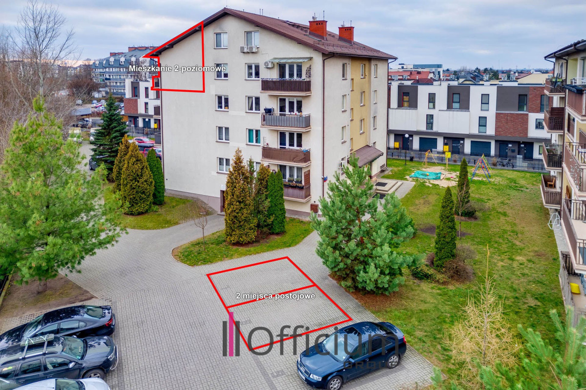 Do dyspozycji są dwa miejsca postojowe pod klatką schodową, na których bez problemu parkują trzy samochody (dodatkowo płatne 90,000 zł - zakup obligatoryjny). Nieruchomość znajduje się na zamkniętym, monitorowanym osiedlu z placem zabaw, a las położony jest zaledwie 50 metrów od bramy osiedla, co daje bezpośredni dostęp do terenów spacerowych i rekreacyjnych.