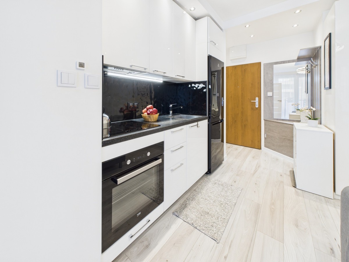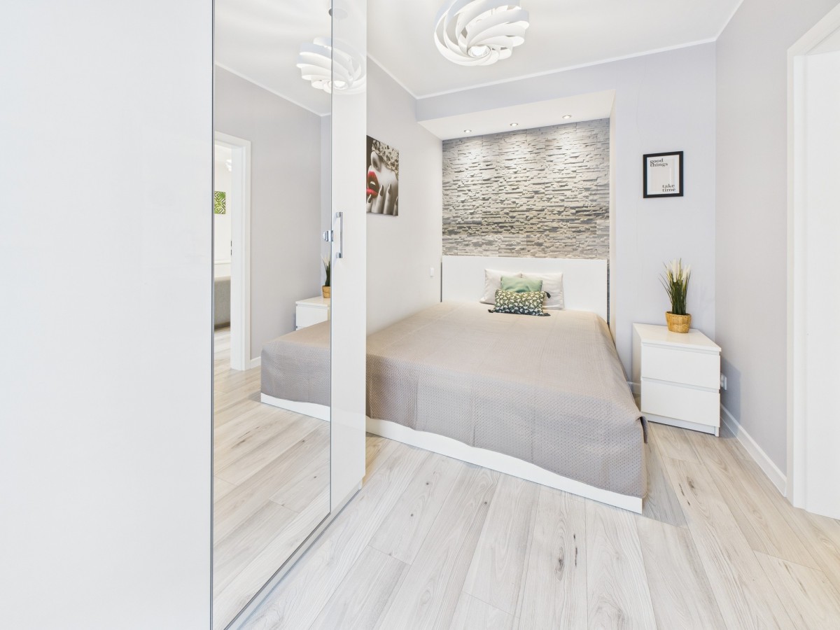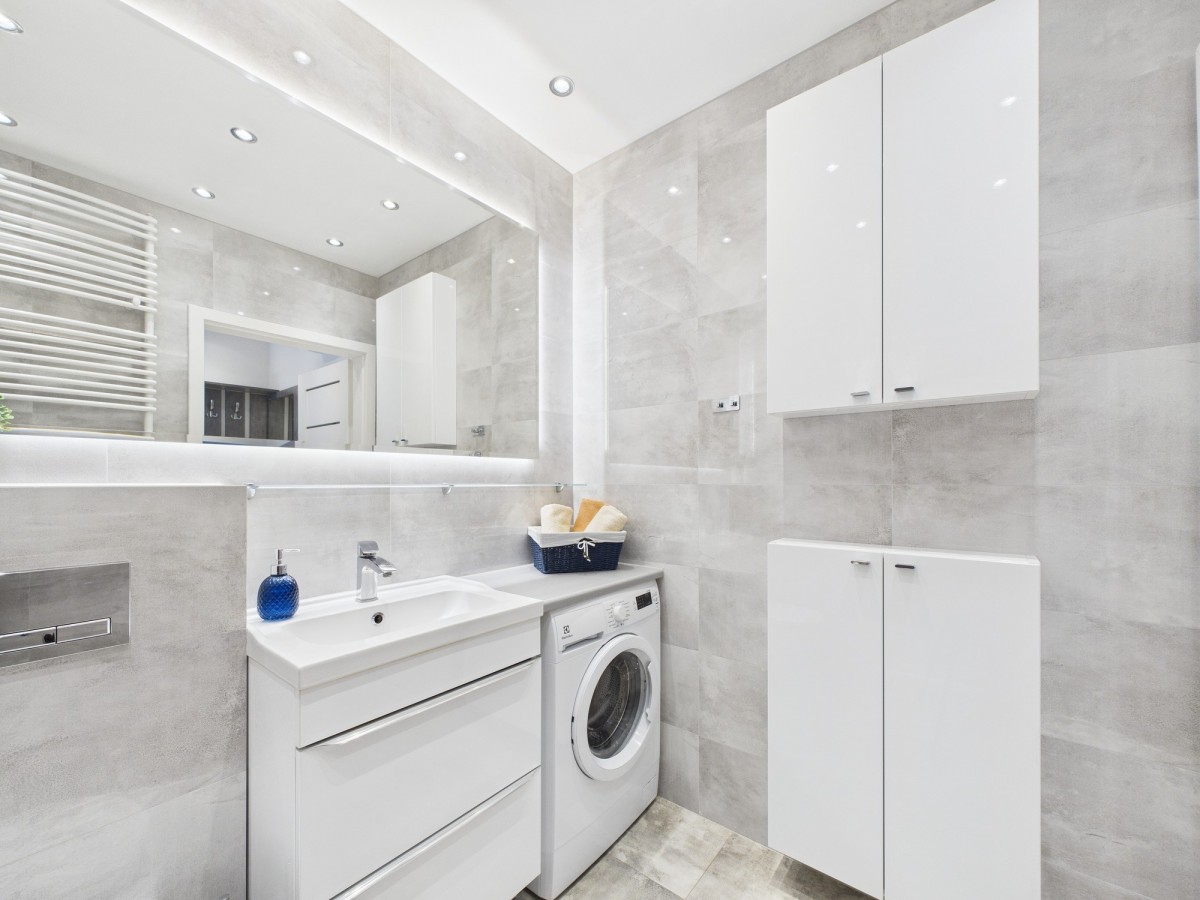 Wnętrze zostało wyposażone w wysokiej jakości sprzęt i zabudowę, a liczne szafy i praktyczne rozwiązania zapewniają mnóstwo miejsca do przechowywania, dzięki czemu mieszkanie pozostaje zawsze uporządkowane i funkcjonalne.