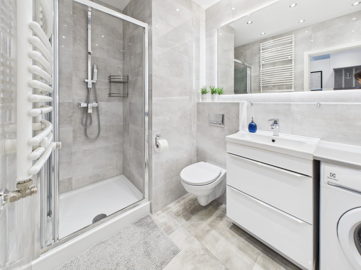 Łazienka z wc to funkcjonalna strefa codziennej pielęgnacji, utrzymana w nowoczesnym i przyjemnym klimacie. Przestrzeń pozwala na komfortowe przygotowanie się do dnia lub wieczorny relaks pod prysznicem.