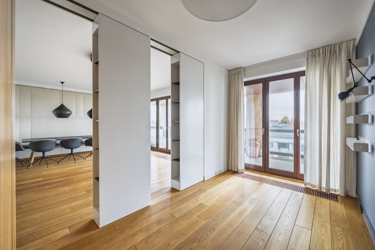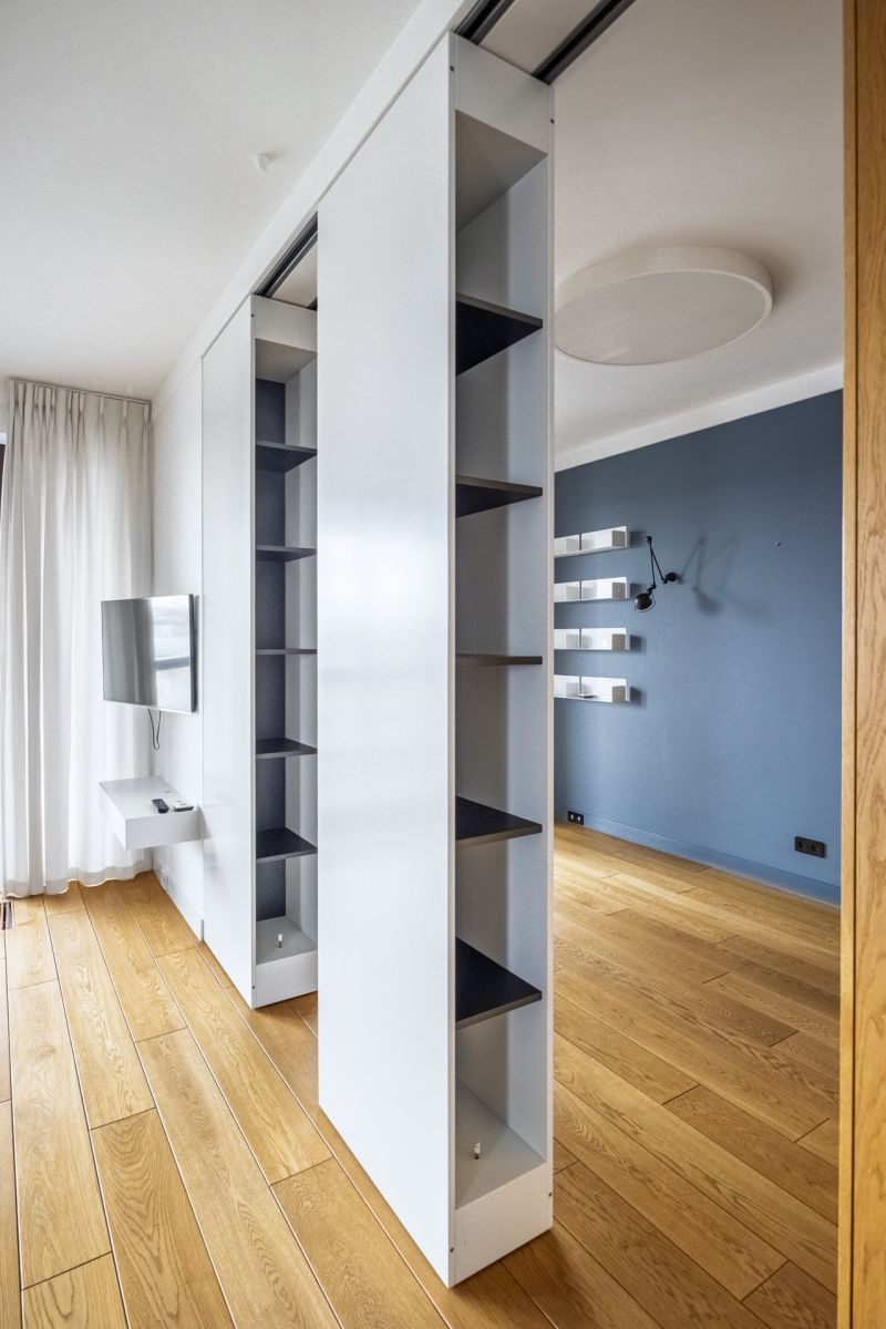 * gabinet/pokój gościnny z inteligentną, przesuwną ścianą, która pozwala na dowolną aranżację przestrzeni.