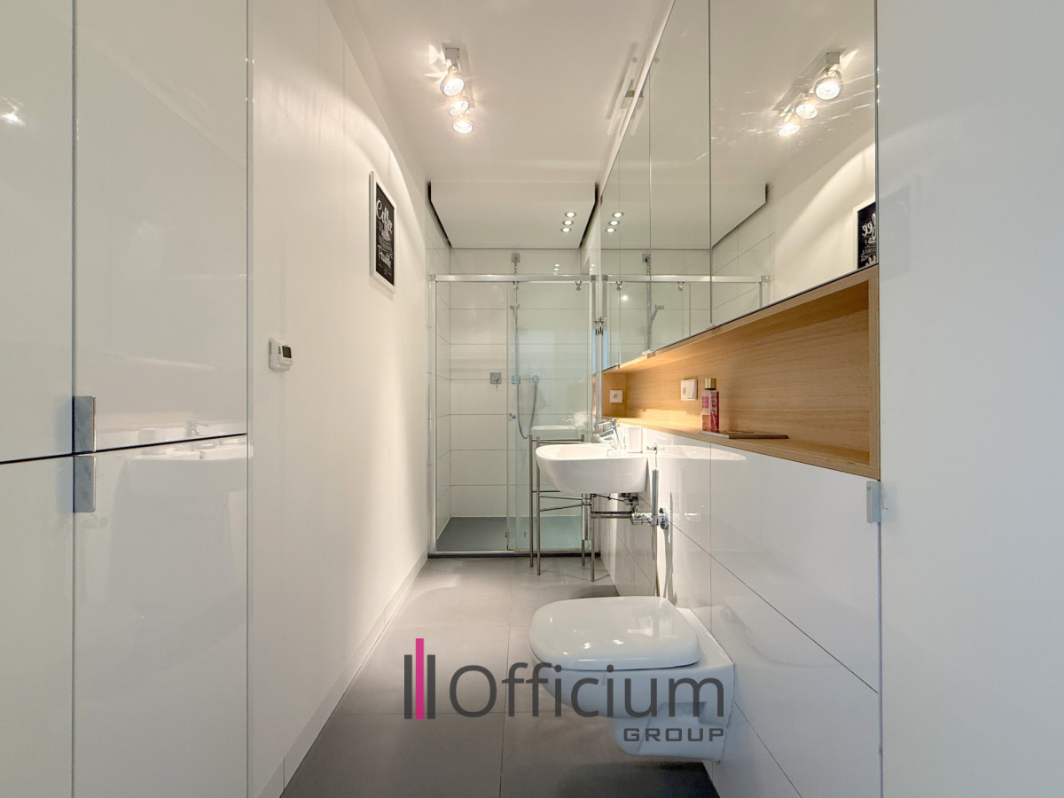 Mieszkanie zostało wykończone i wyposażone z dbałością o funkcjonalność oraz estetykę, przy użyciu materiałów dobrej jakości. W pełni wyposażona kuchnia w niezbędny sprzęt AGD, w tym m. in.: zmywarkę, piekarnik, mikrofalówkę, lodówko-zamrażarkę oraz płytę indukcyjną. Łazienka połączona z wc w której znajduje się pralka i bardzo dużo szafek do przechowywania rzeczy.