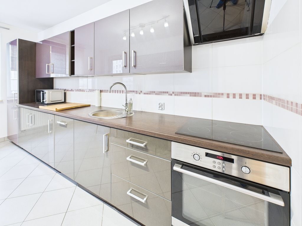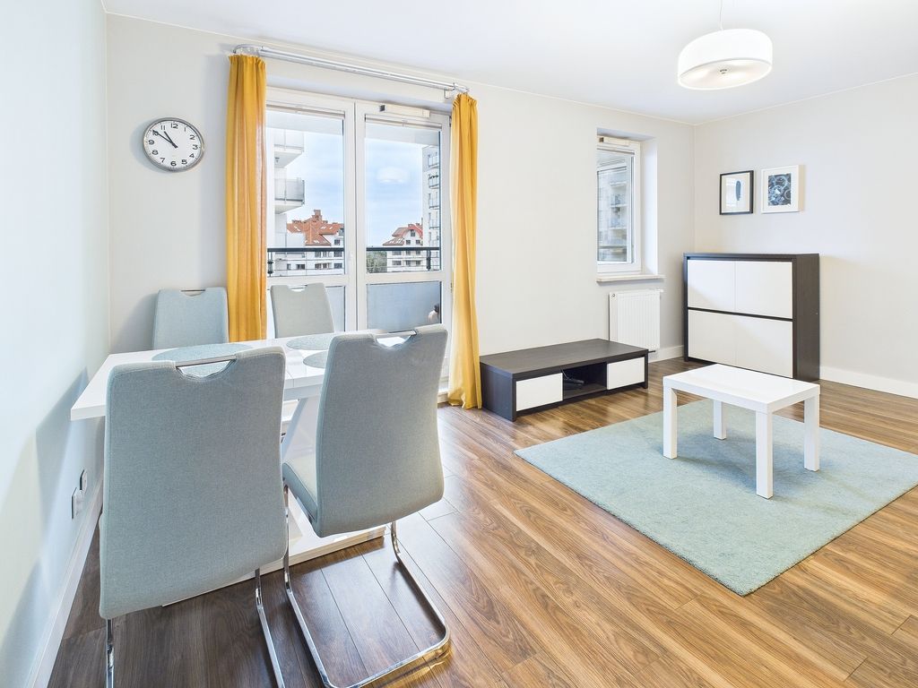 Mieszkanie jest w pełni umeblowane i wyposażone (zmywarka, lodówka, piekarnik, pralka) – gotowe do zamieszkania od zaraz, z podłączonym internetem i telewizją.