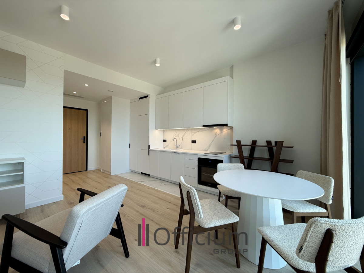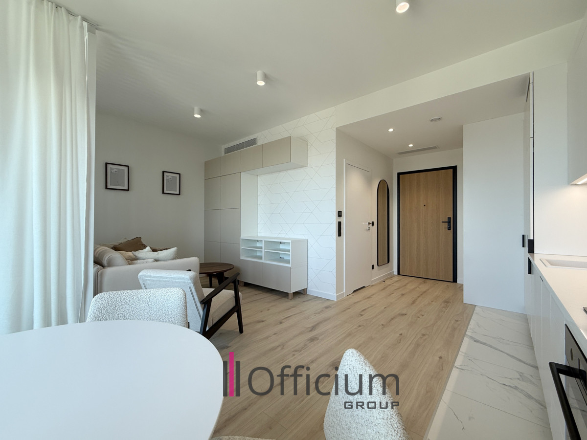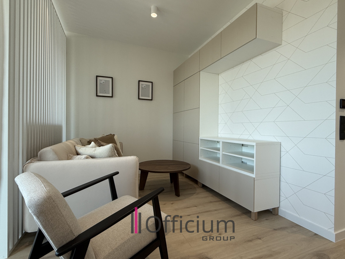 This modern 36 m² apartment, designed by an architect, features a spacious living room with a fully equipped kitchen (including furniture and household appliances), a sliping space, a bathroom with a bathtub, and a hallway with built-in wardrobes.