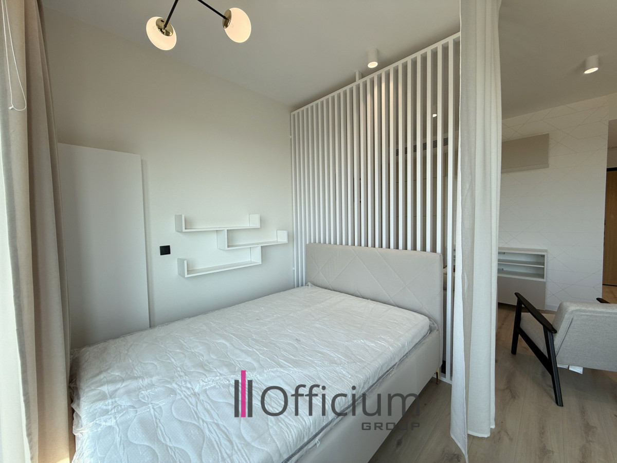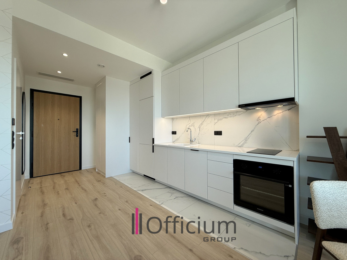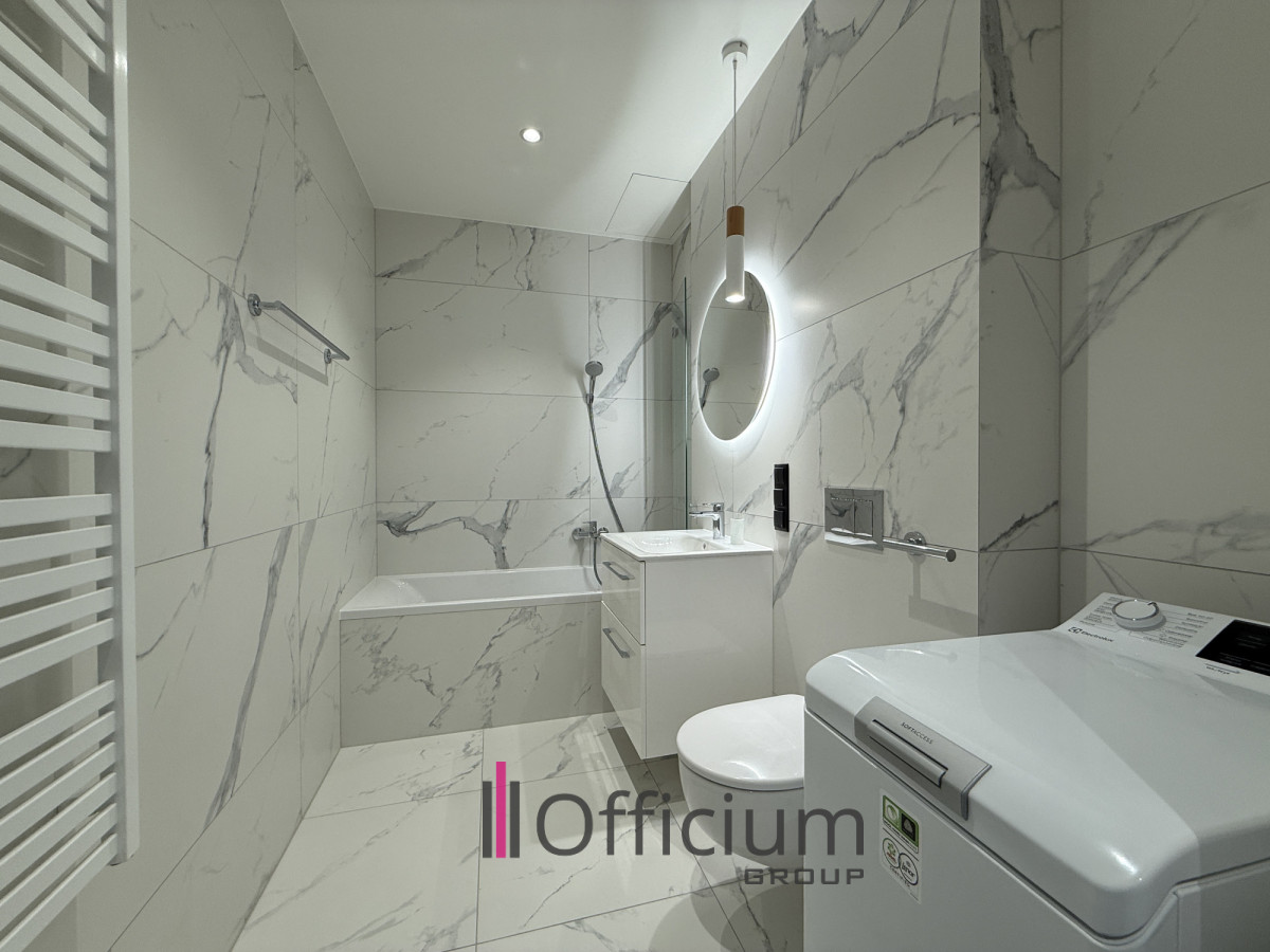 Ten nowoczesny apartament o powierzchni 36,13 m², zaprojektowany przez architekta, składa się z przestronnego salonu z aneksem kuchennym (w pełni wyposażonym w meble i sprzęt AGD), części sypialnej łazienki z wanną oraz korytarza z zabudowaną szafą.