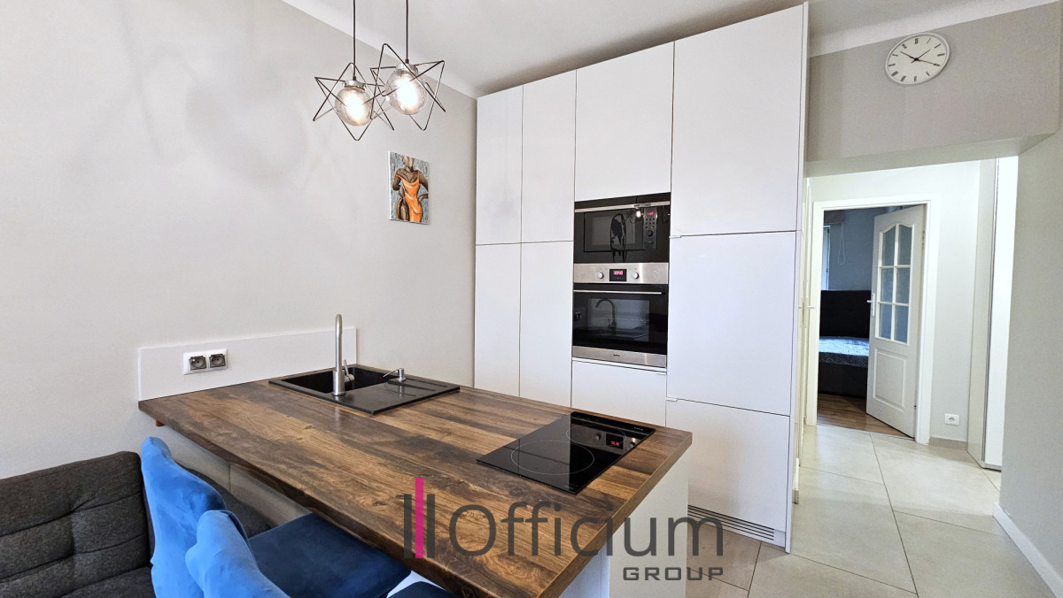 Mieszkanie gustownie zaprojektowane i solidnie wykończone, znajduje się na 3 piętrze bez windy. Składa się z: salonu łączonego z aneksem kuchennym, sypialni z szafą, przedpokoju z szafą i łazienki z prysznicem. Kuchnia wyposażona w sprzęt AGD (lodówko-zamrażarka, piekarnik, zmywarka itp.). Apartament w pełni umeblowany jak na zdjęciach.