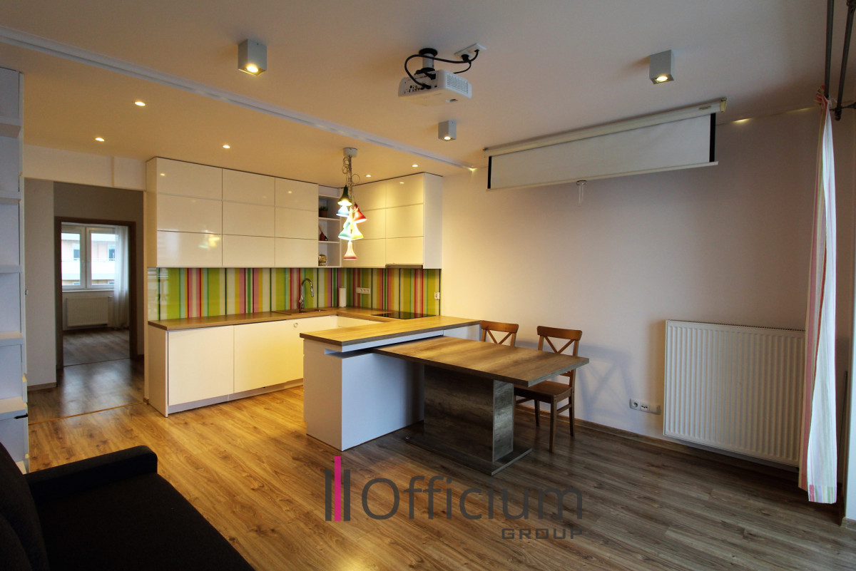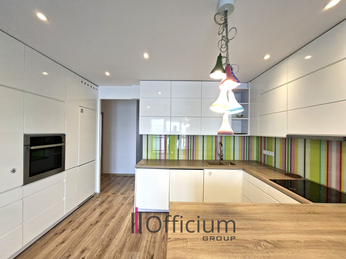 Kuchnia jest w pełni umeblowana i wyposażona w wysokiej jakości sprzęt AGD: lodówkę, piekarnik, zmywarkę oraz płytę indukcyjną.