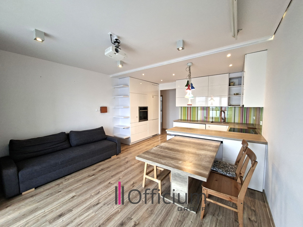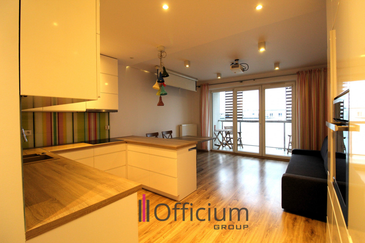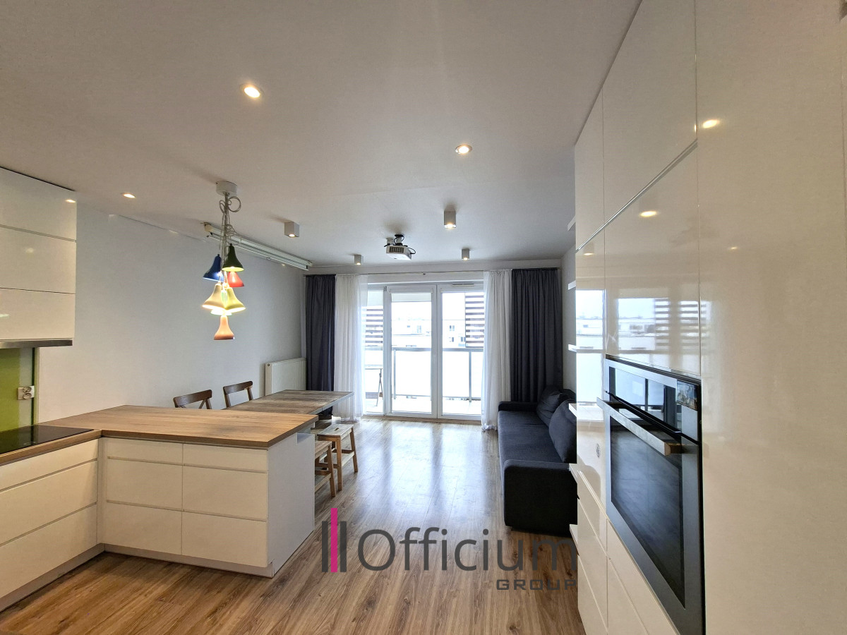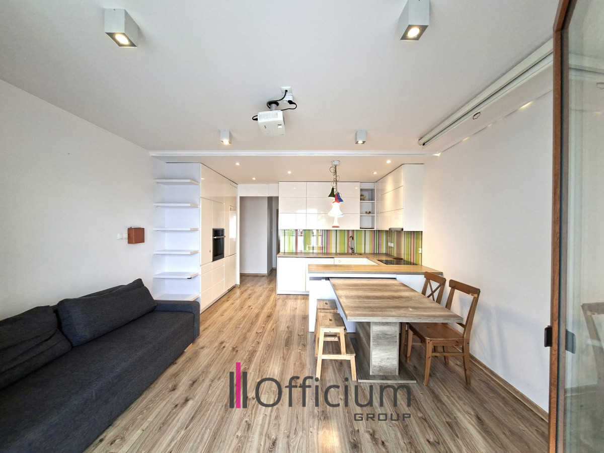 W salonie znajduje się wygodna kanapa z funkcją spania, rozkładany stół z krzesłami oraz zestaw kinowy (podwieszany rzutnik i rozkładany ekran). Bezpośrednio z salonu prowadzi wyjście na balkon o powierzchni 7 m² z widokiem na patio oraz panoramę Warszawy. Na balkonie znajduje się stolik i dwa krzesła.