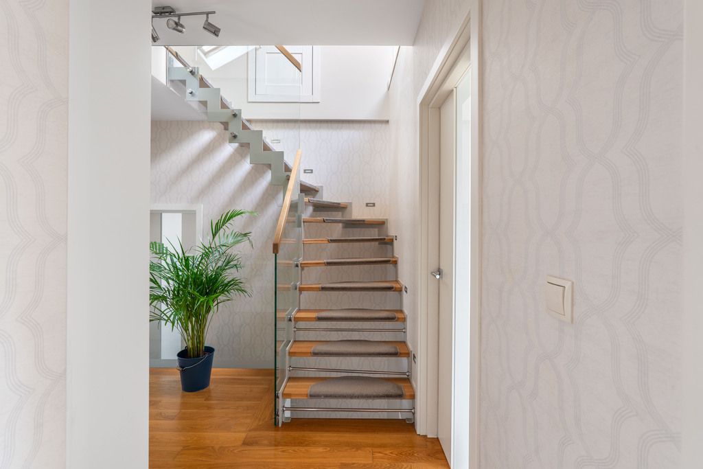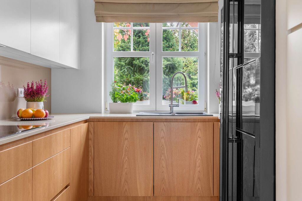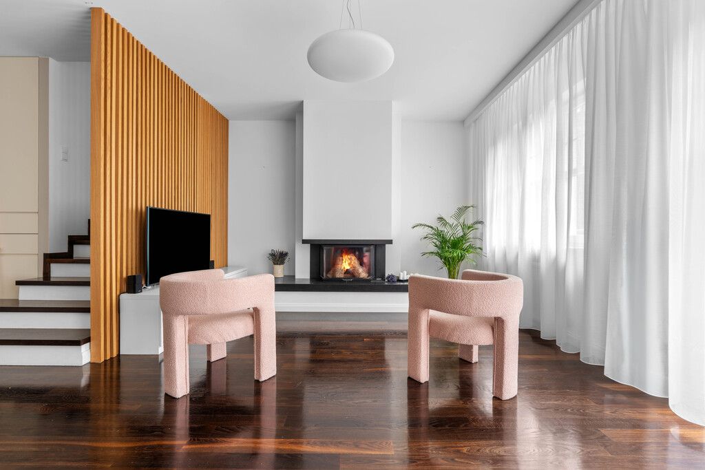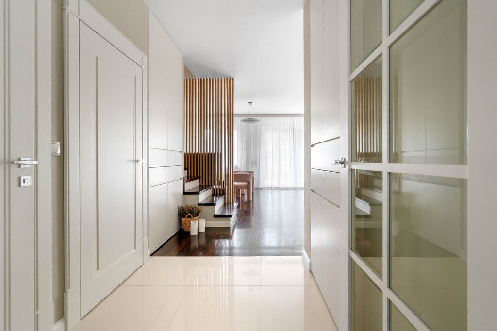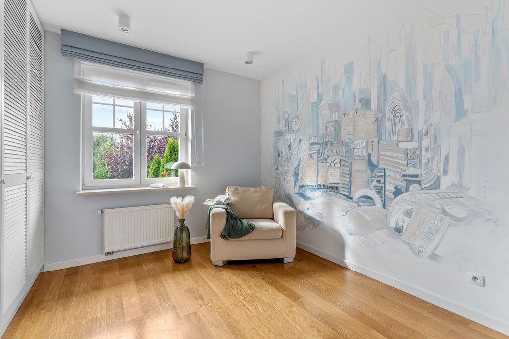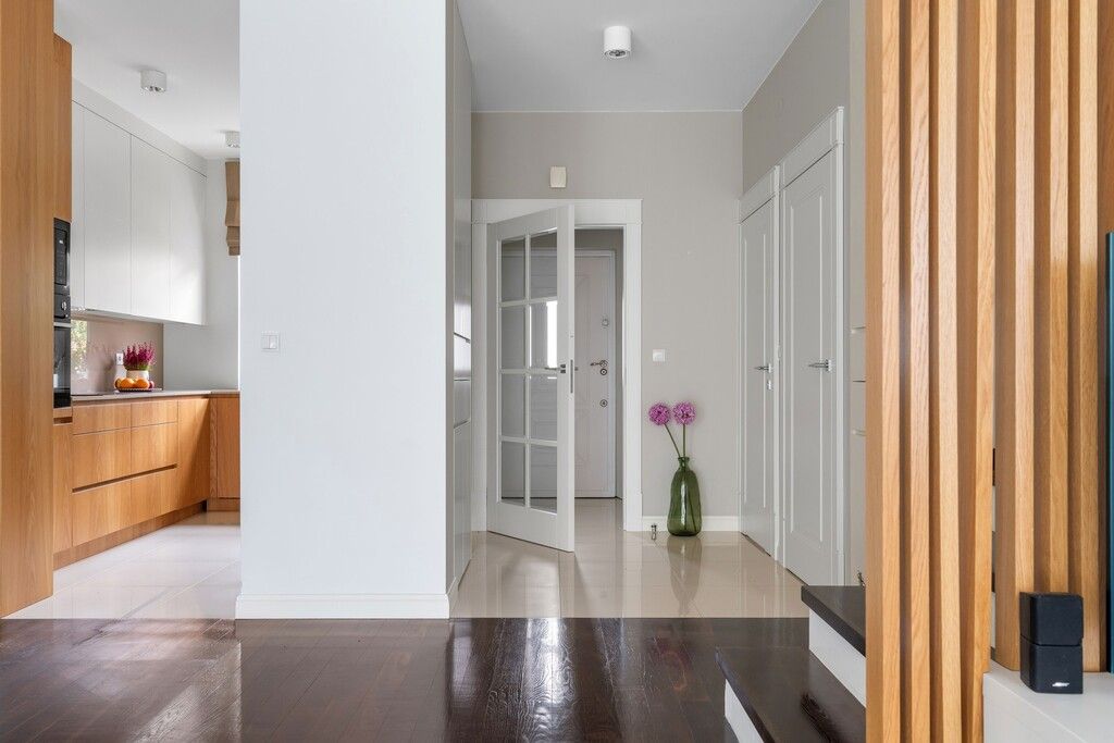Dom jest wykończony w eleganckim, uniwersalnym stylu, z dbałością o szczegóły. Zabudowy stolarskie na wymiar są idealnie wpasowane w przestrzeń. Podłogi i schody wykonane są z litego drewna. Kuchnia w zabudowie na wymiar, fronty fornirowane, blat kamienny, sprzęt AGD.