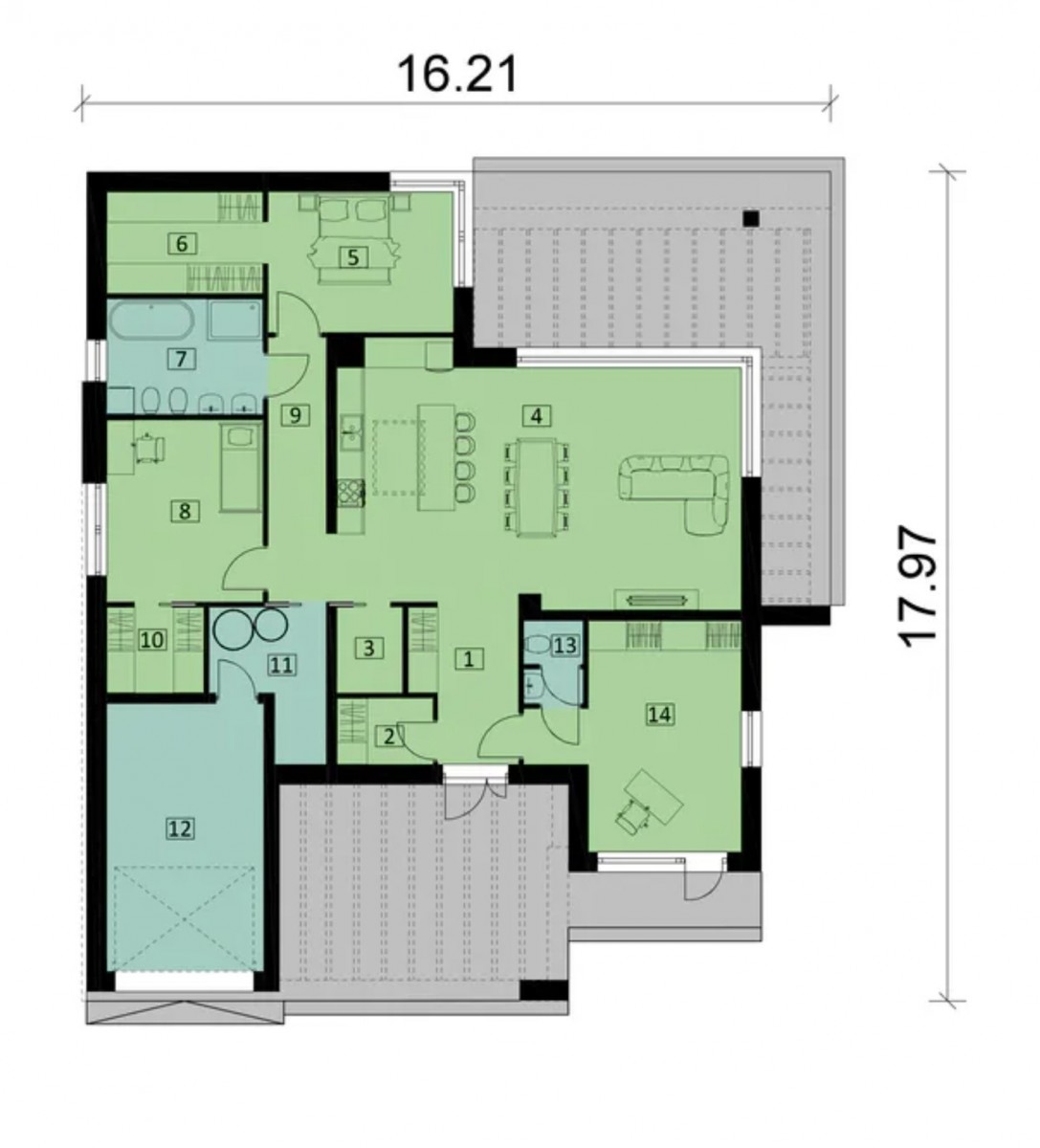 - Strefa dzienna - open space: duża kuchnia + jadalnia + salon