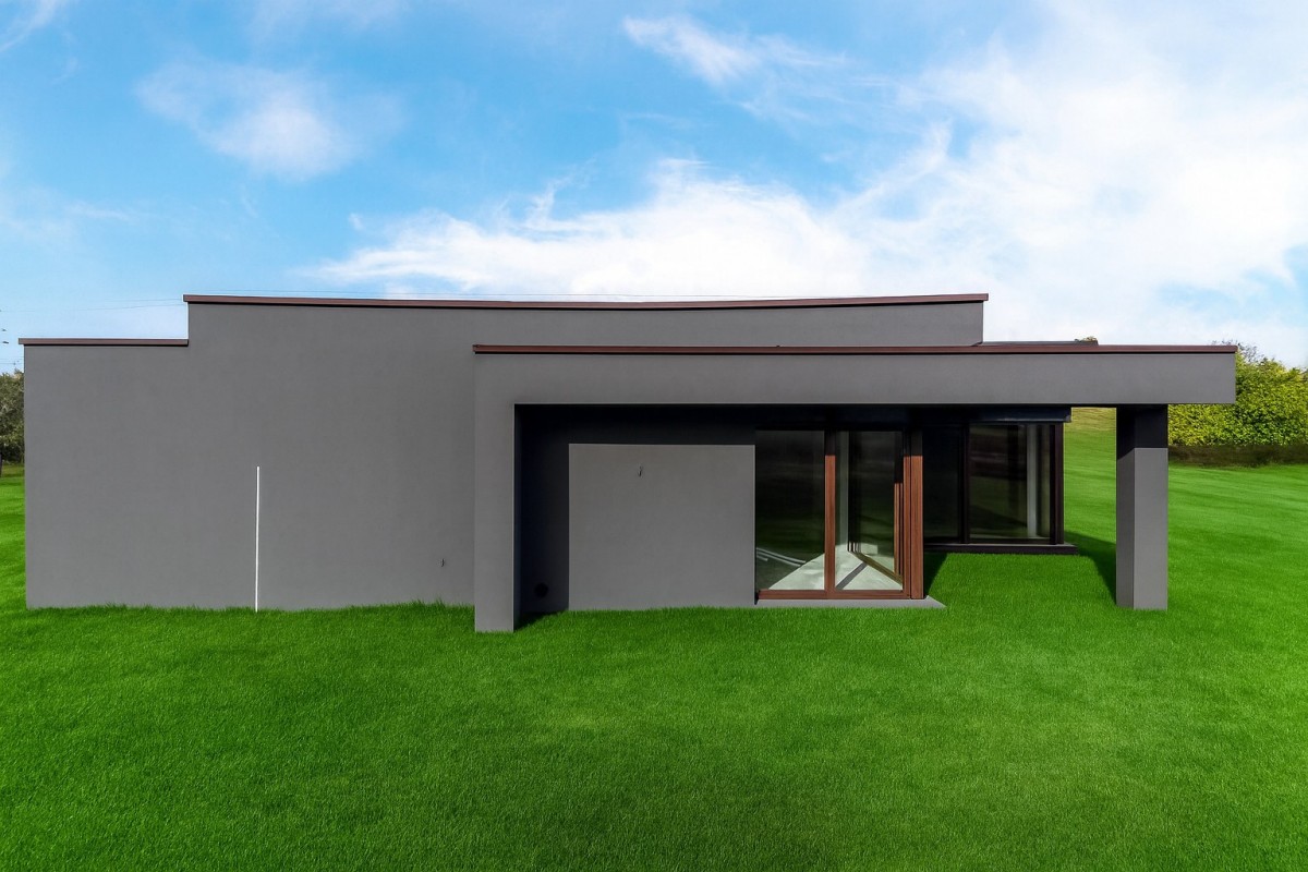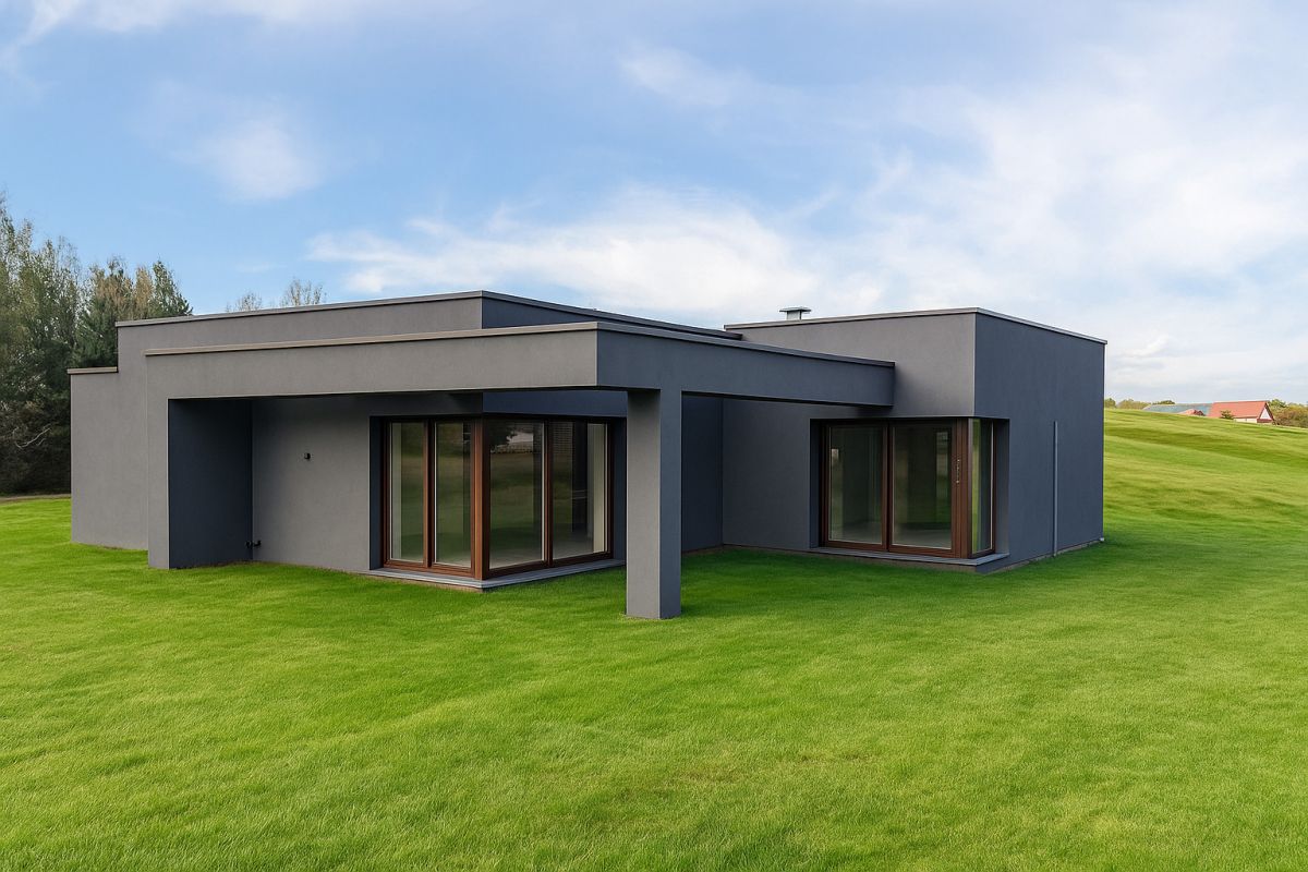 - Minimalistyczna bryła, płaski dach, grafitowa elewacja