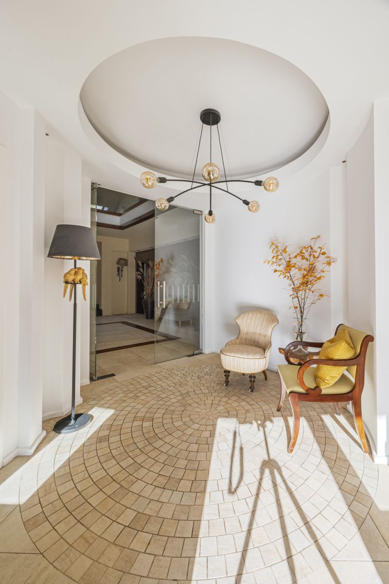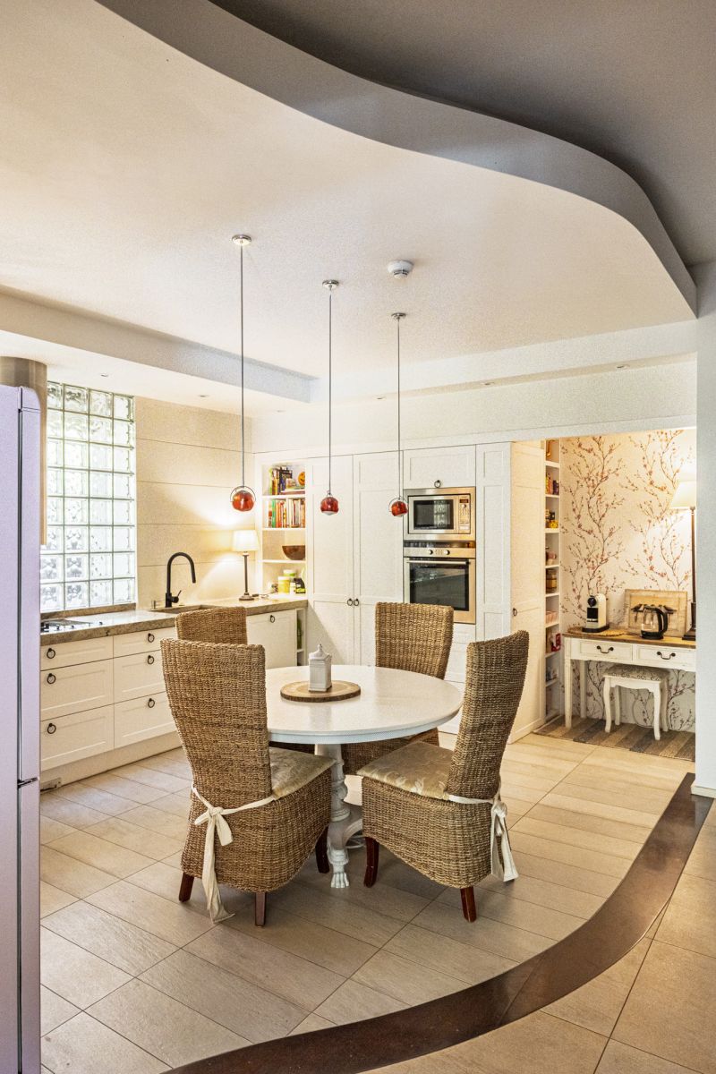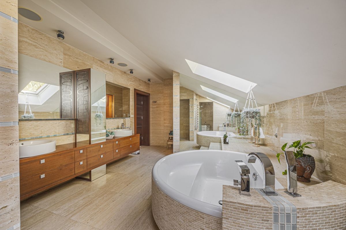 * Podłogi: klepka drewniana, kamień naturalny / terakota, gres antypoślizgowy w garażu.