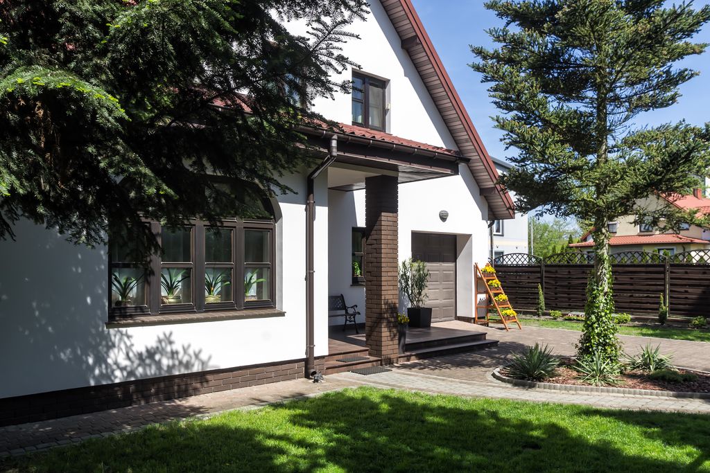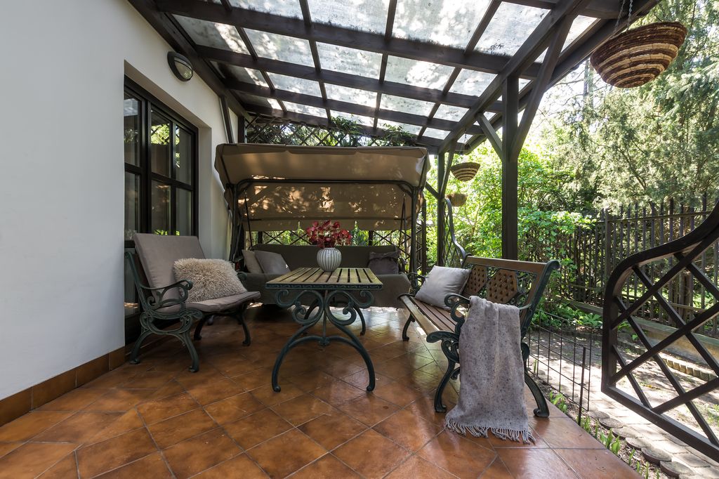 Ogród i otoczenie: Elegancko zaaranżowany ogród z hortensjami, rododendronami, skalniakiem z bylinami oraz nasadzeniami wzdłuż ogrodzenia: cisami, świerkami, jałowcami i jodłami. Zadaszenie w ogrodzie idealne na letnie wieczory.