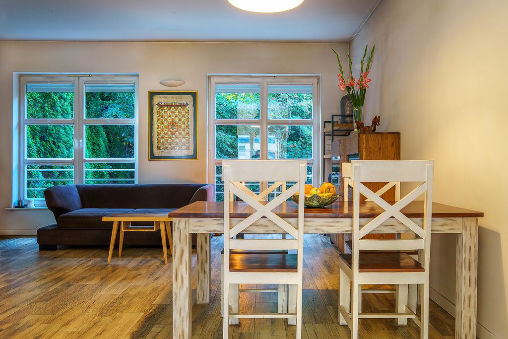 W salonie i kuchni wysokie dwuskrzydłowe okna wprowadzające do wnętrza dużo światła.