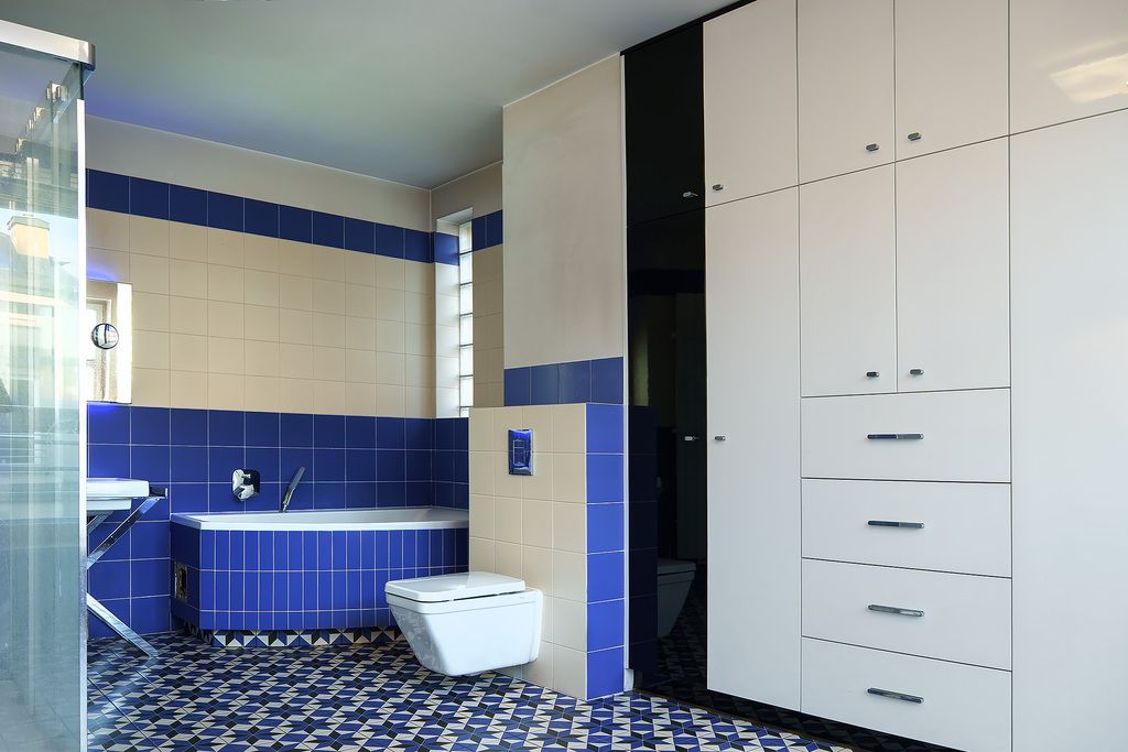 - łazienka 16,3 m² z wanną, prysznicem, obszerną szafą w zabudowie oraz dużym oknem