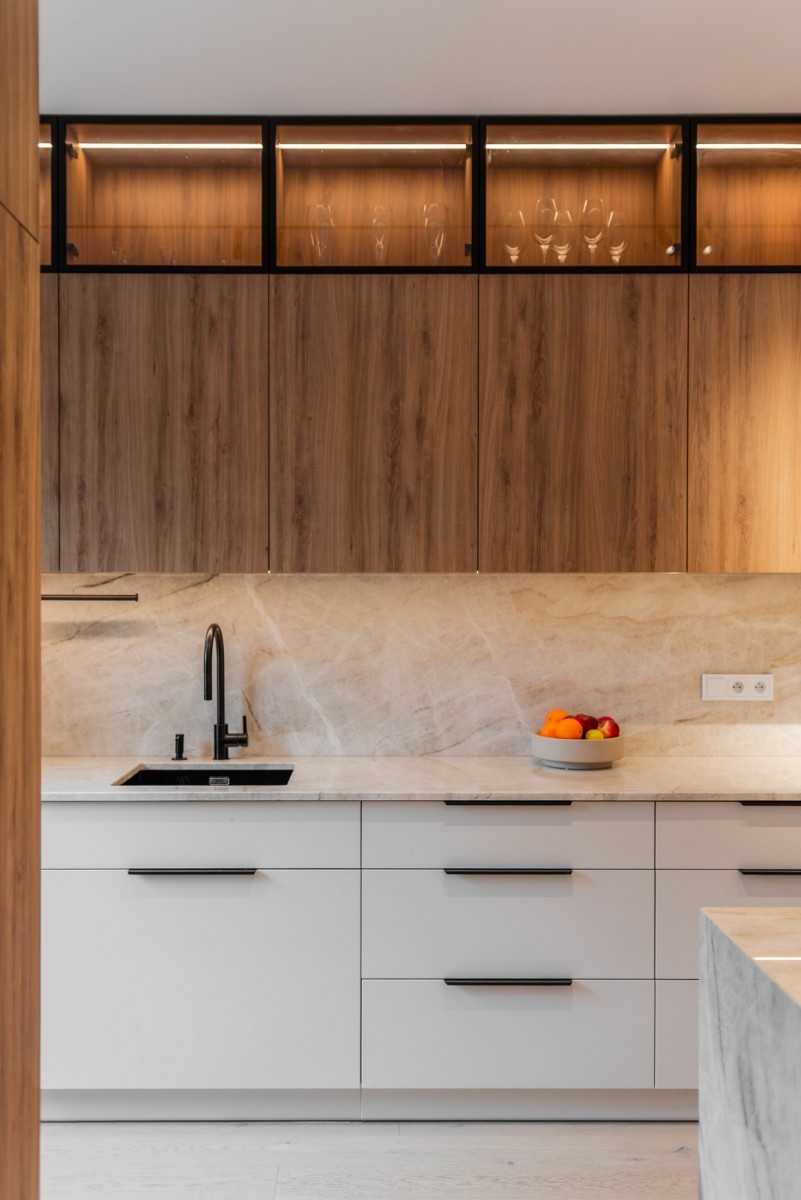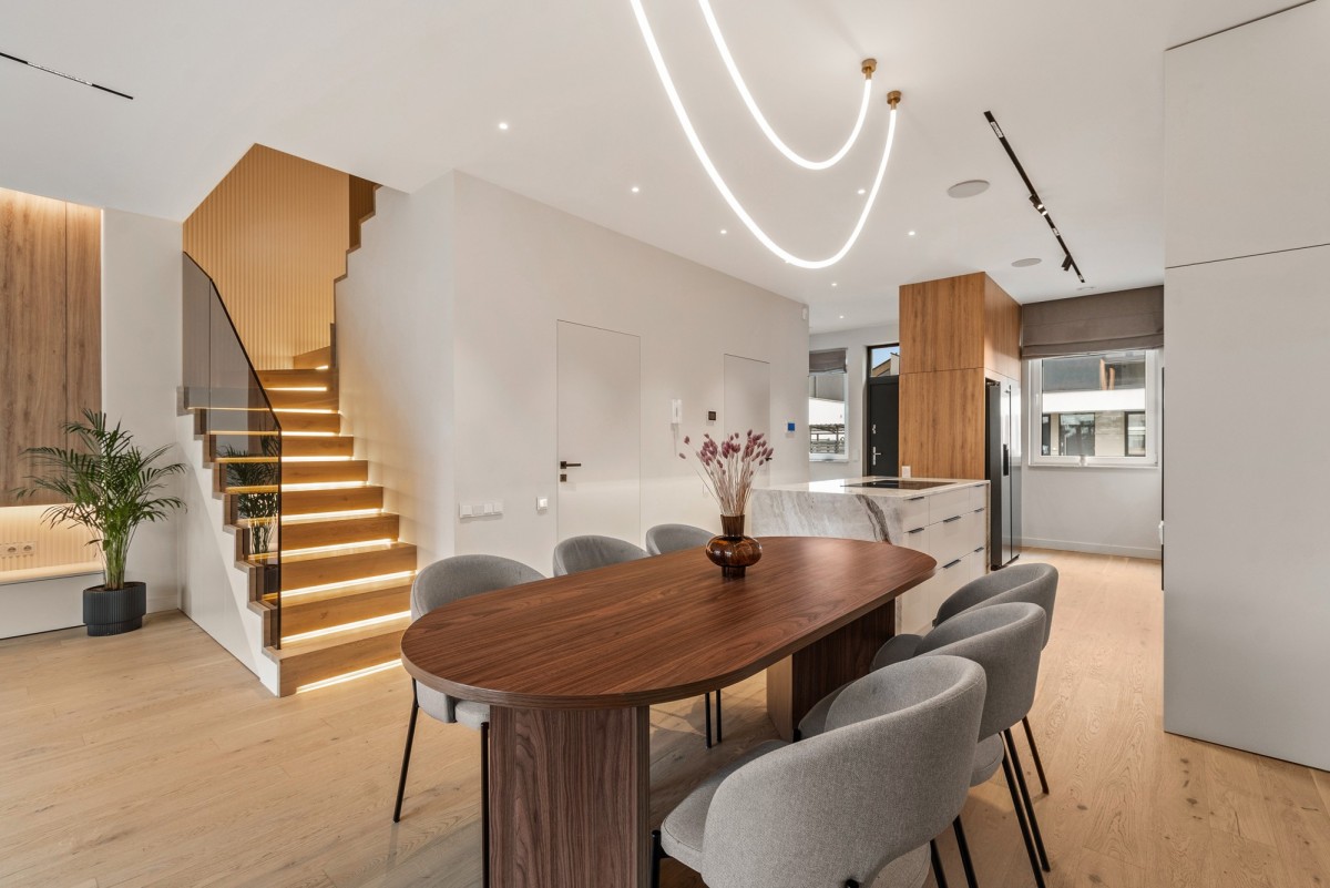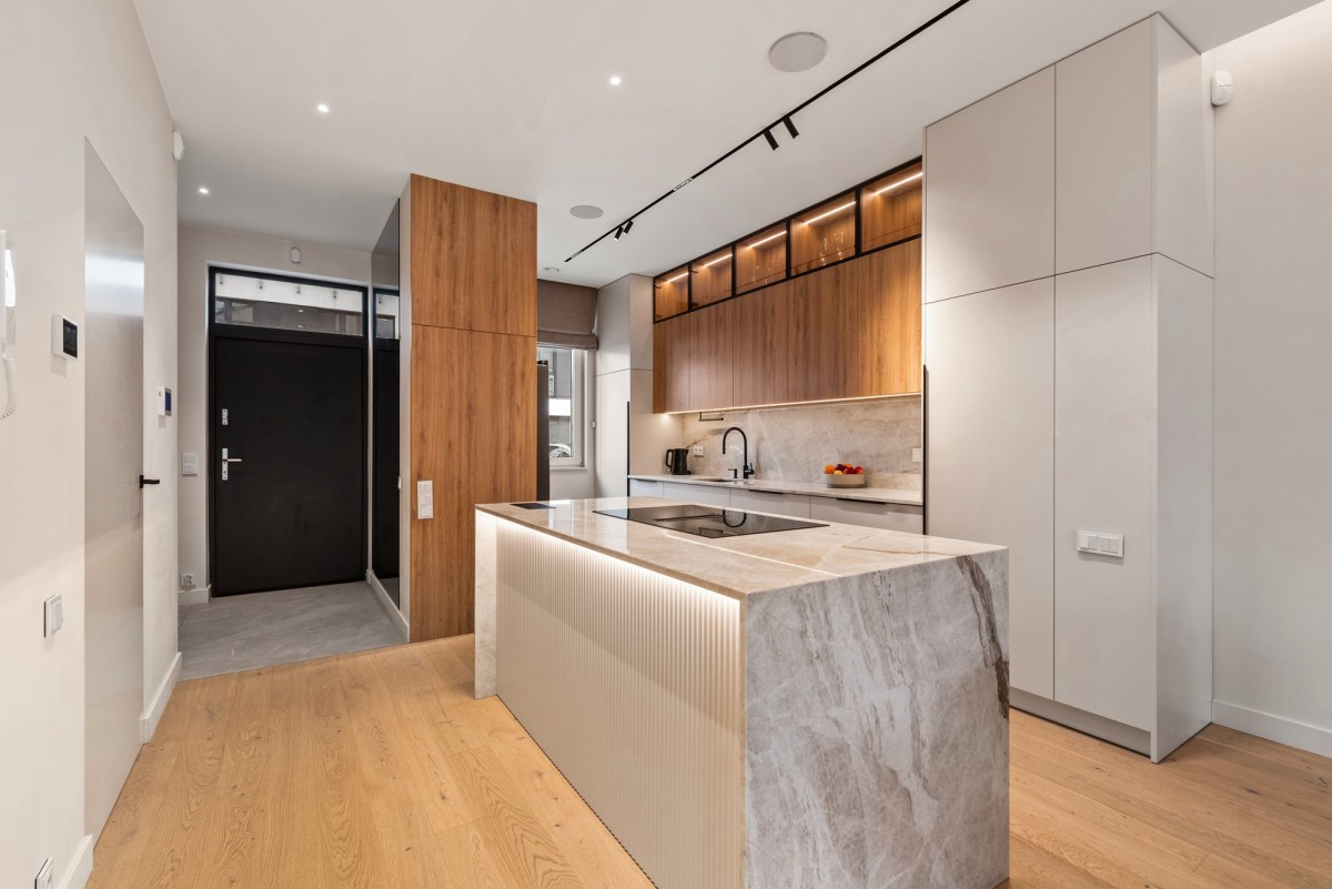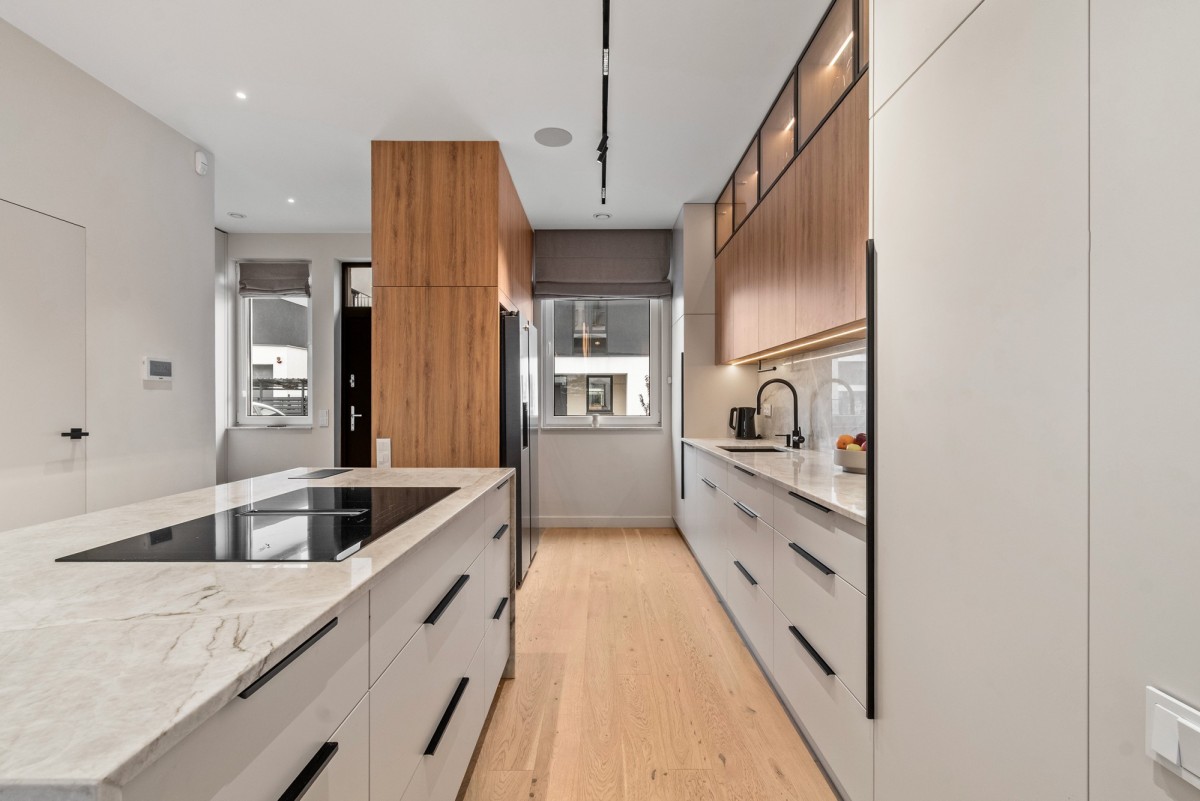 - przestronny salon z kominkiem, połączony z nowoczesną kuchnią (sprzęty Samsung i Electrolux, blaty z kwarcytu Taj Mahal)