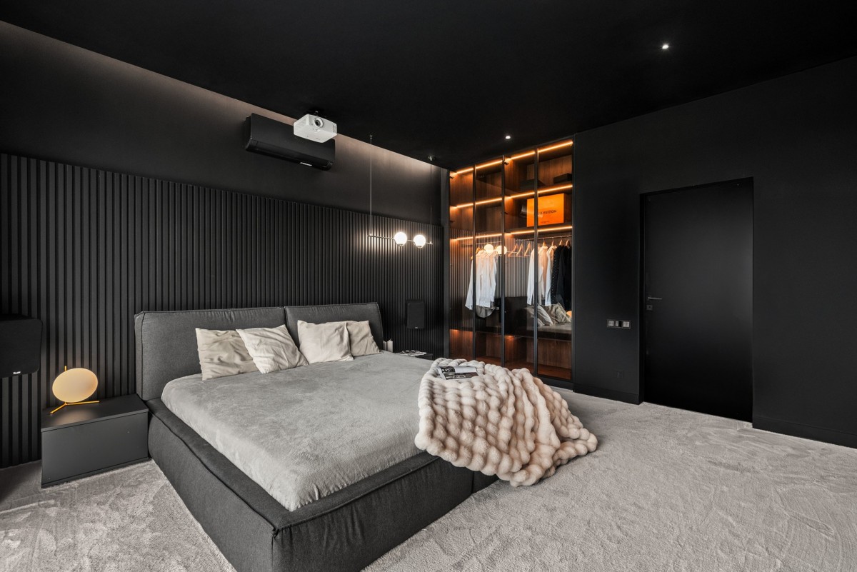 - Master bedroom z garderobą i prywatną łazienką w stylu spa ( kino domowe,t apicerowane łóżko 200x200 cm, zasłony zaciemniające i wygłuszenie ścian oraz podłóg)
