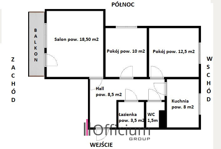 Lokal o rozkładowym układzie, o pow. 65,63 m² na co składa się: salon, dwie sypialnie, widna kuchnia, łazienka, osobne WC, przedpokój. Trójstronna ekspozycja okien (północ, wschód, zachód) co daje dużo naturalnego światła przez cały dzień i możliwość szybkiego przewietrzenia.