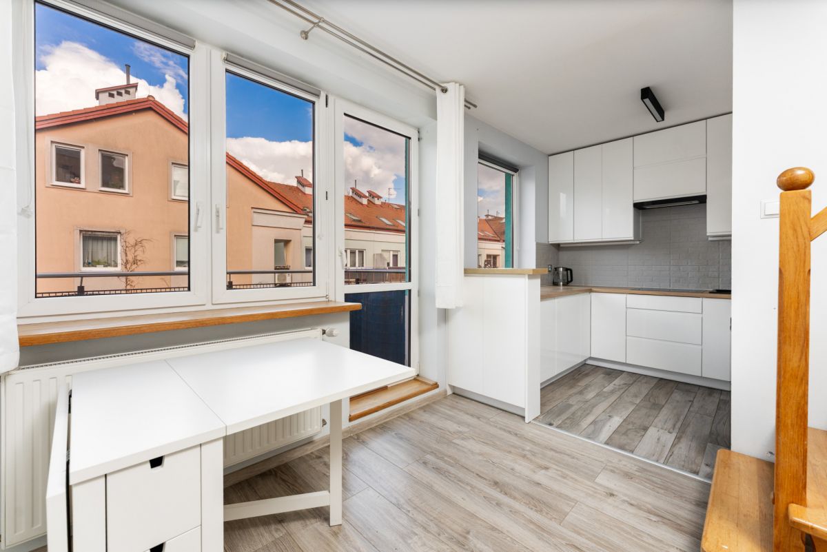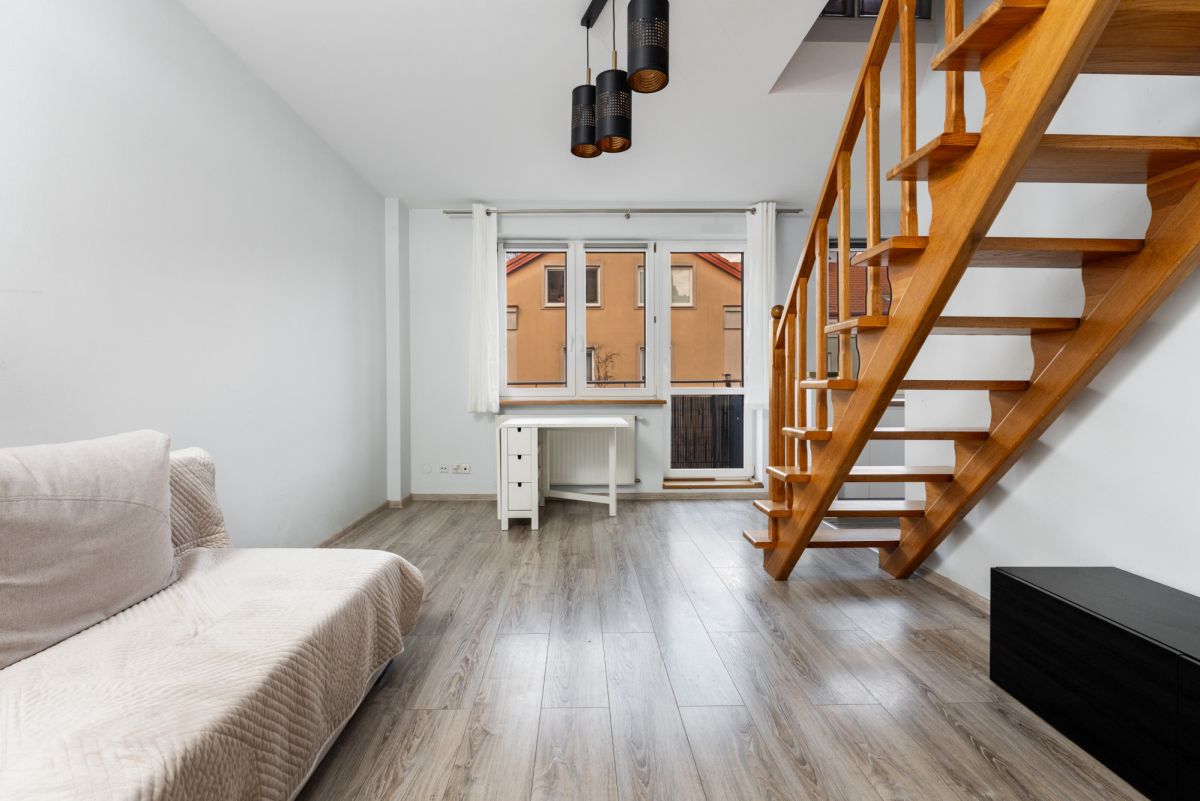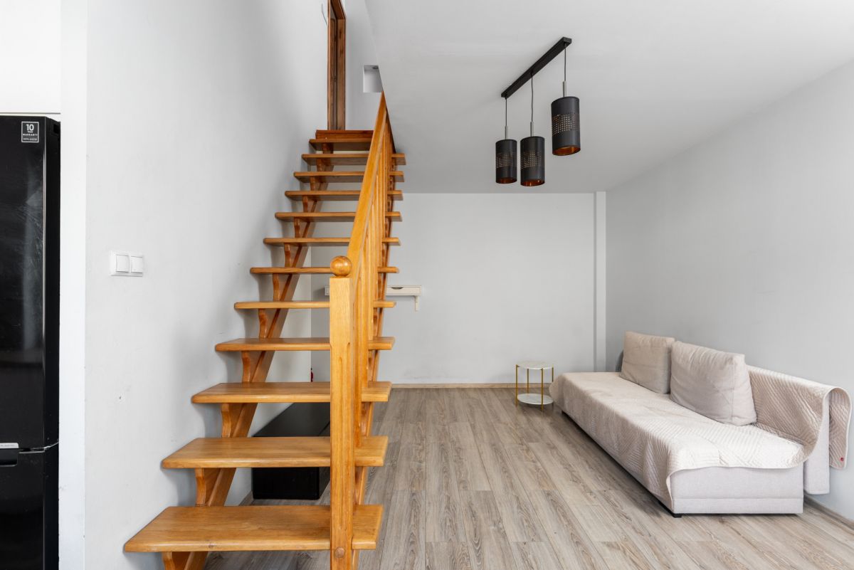 Dwupoziomowe mieszkanie o powierzchni blisko 80 m² znajduje się na 3 piętrze w pastelowym budynku z początku lat 2000. Lokal jest wyremontowany i wyróżnia się bardzo funkcjonalnym układem, który naturalnie oddziela strefę dzienną od prywatnej. Mieszkanie spełni potrzeby rodziny, pary pracującej zdalnie lub dwóch osób, które potrzebują sypialni i dodatkowej przestrzeni do pracy