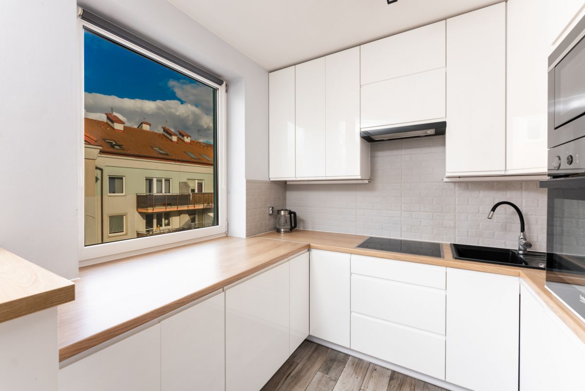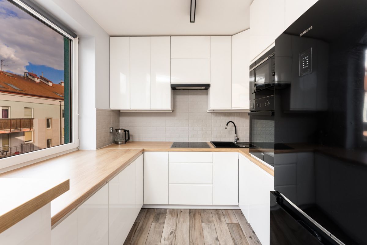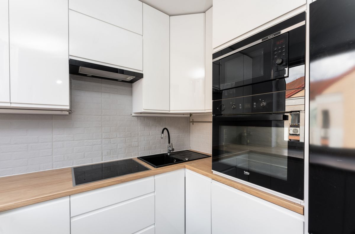 * Salon połączony jest z w pełni wyposażona kuchnia z niezbędnym sprzętem AGD - piekarnikiem, płytą indukcyjną, zmywarką oraz lodówką z zamrażarką.