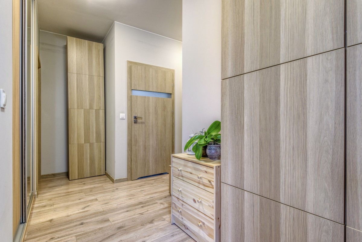Na szczególną uwagę zasługuje również funkcjonalna garderoba o powierzchni 4,5 m² z oknem, która obecnie pełni rolę wygodnego domowego biura, doskonałego do pracy zdalnej. Istnieje możliwość łatwego przywrócenia pierwotnego układu mieszkania bez garderoby.