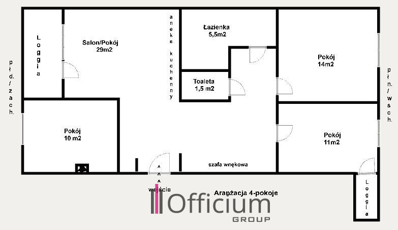 dwa oddzielne pokoje (ok. 14 m² i 11 m²), przy czym mniejszy pokój posiada wyjście na drugą zabudowaną loggię;