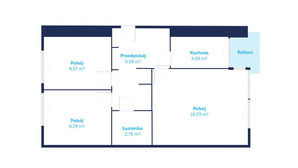 - trzy pokoje ( ok. 17m2, ok. 9 m2, ok. 9 m2)