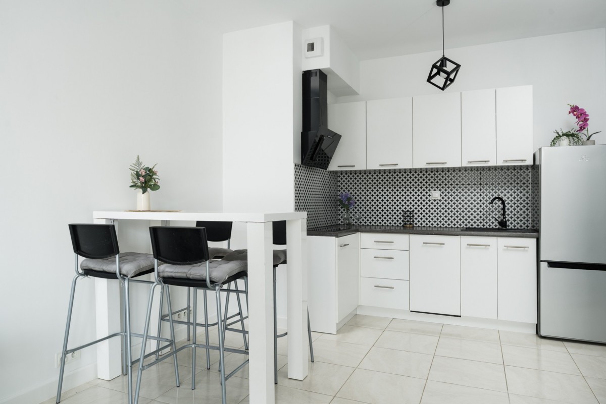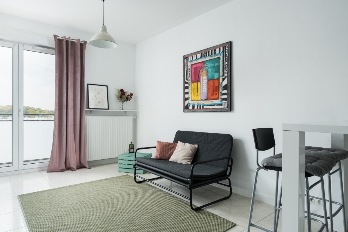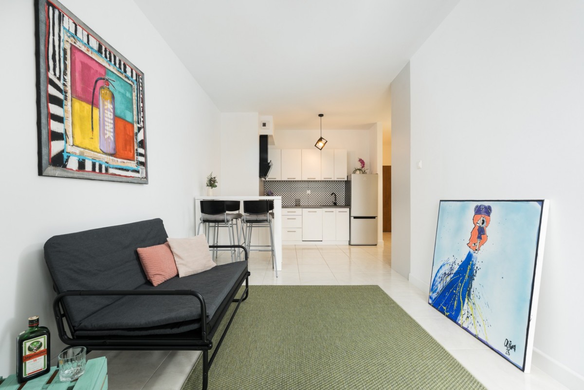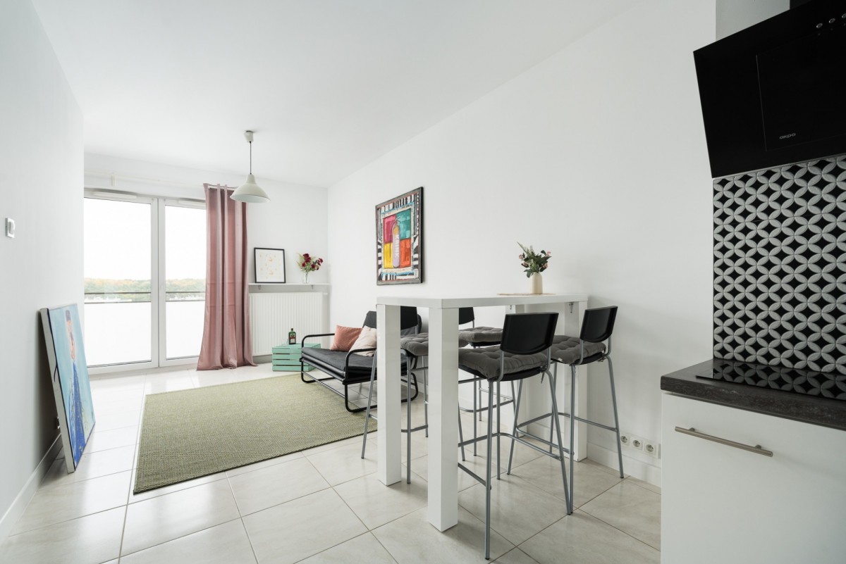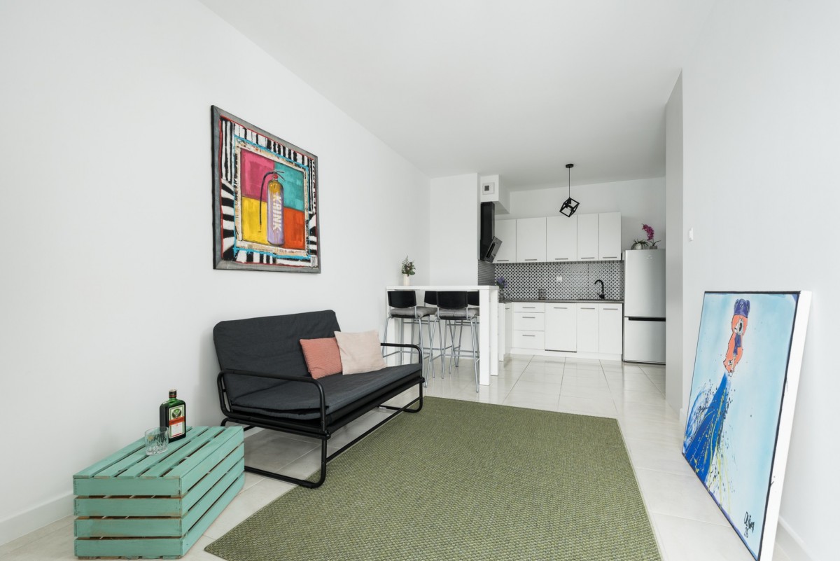 • salon z aneksem kuchennym i wyjściem na duży balkon