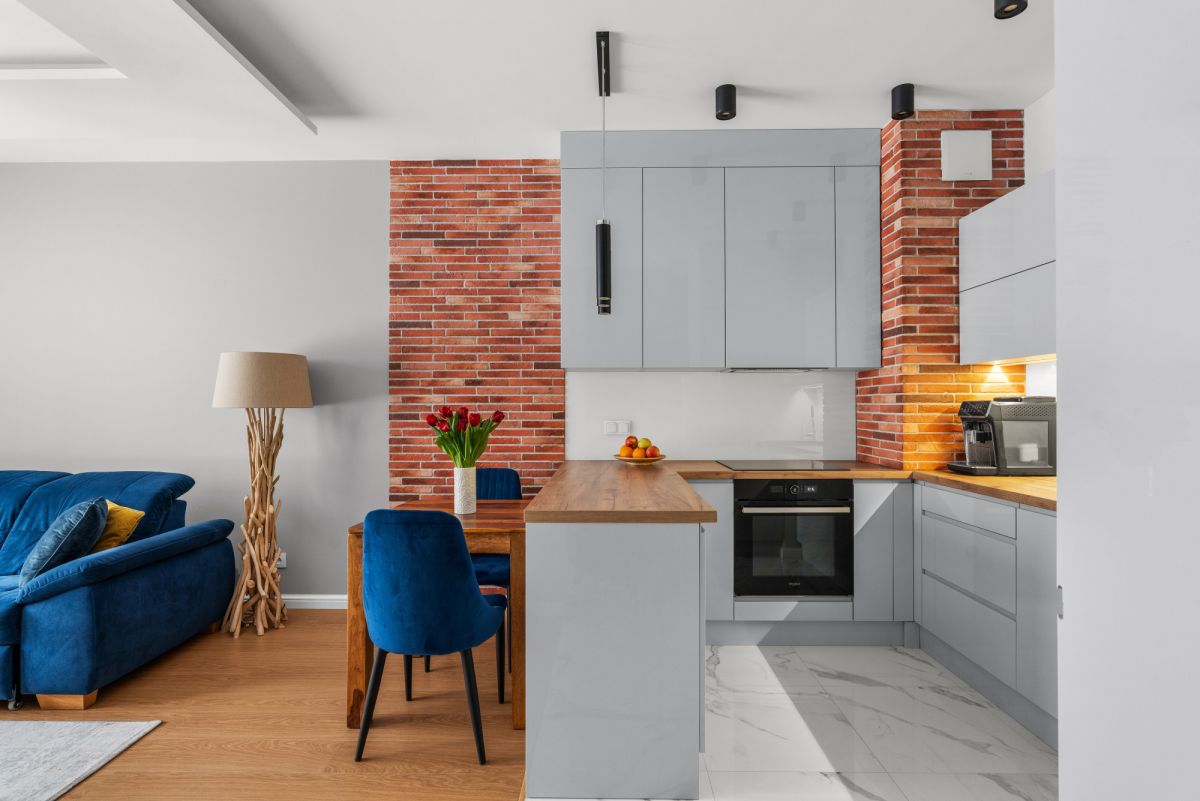 -Salon z aneksem kuchennym - jasna przestrzeń z wyjściem do ogródka