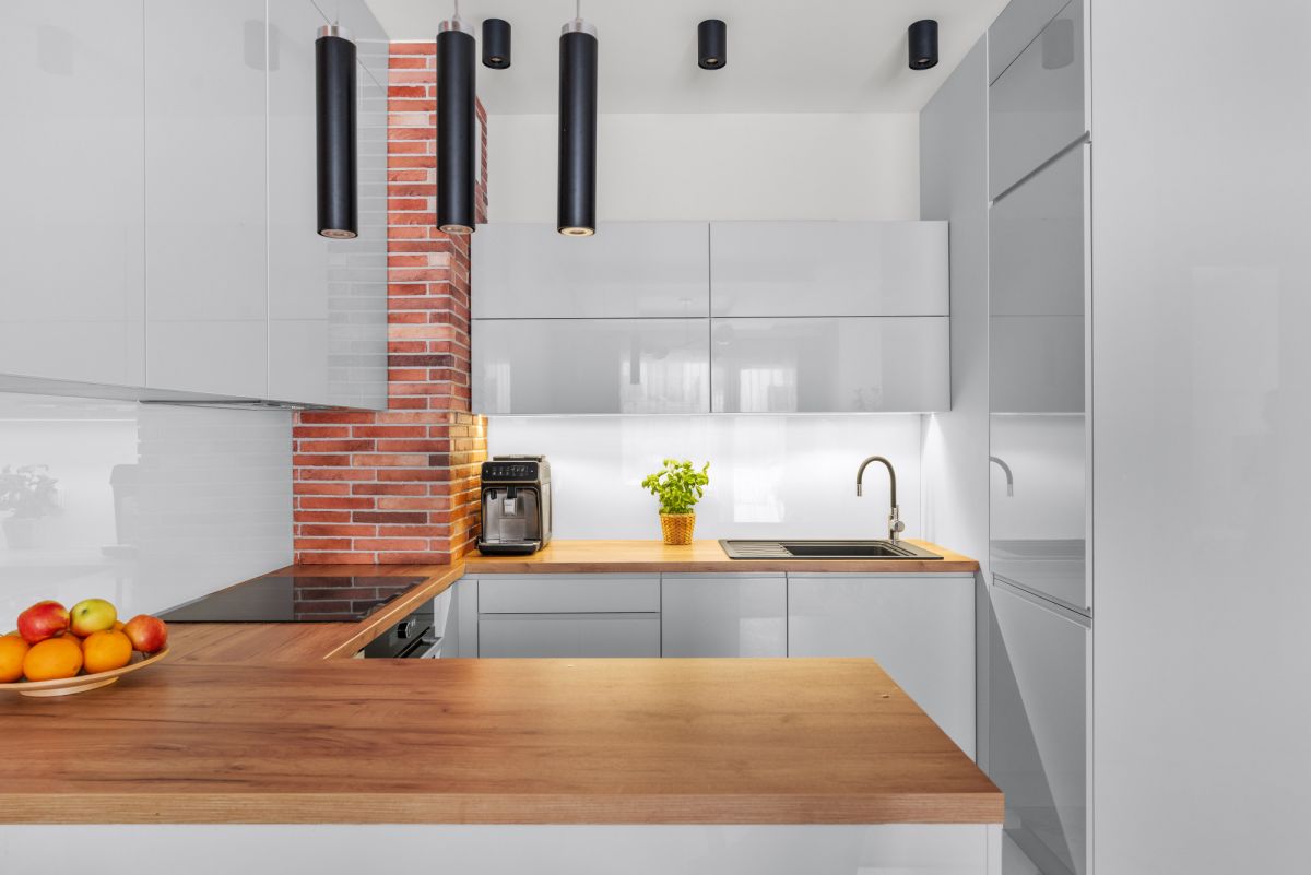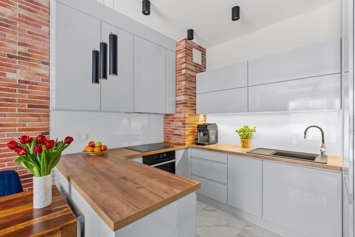 -Kuchnia w zabudowie z wysokiej jakości sprzętem AGD: lodówka, płyta indukcyjna, zmywarka, piekarnik