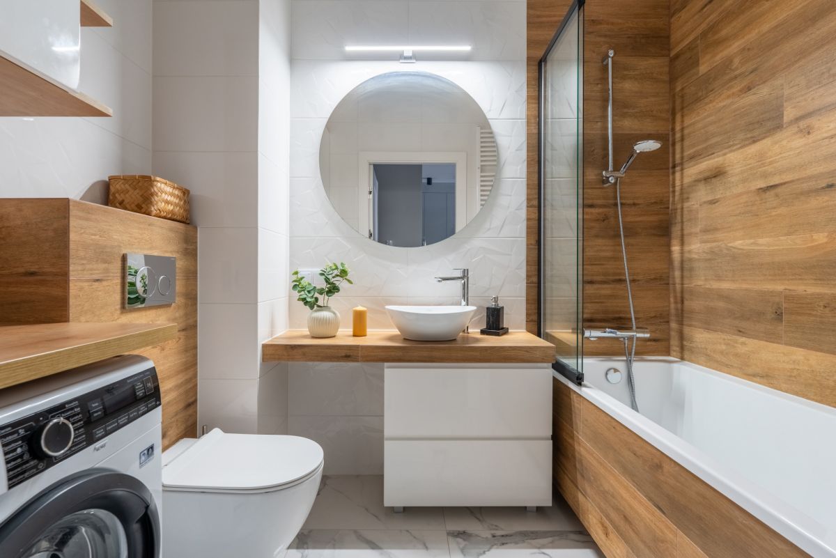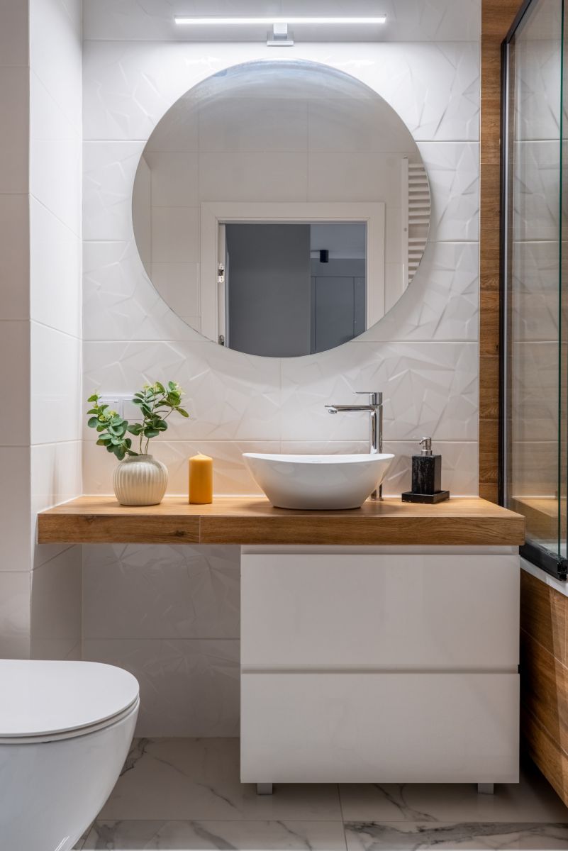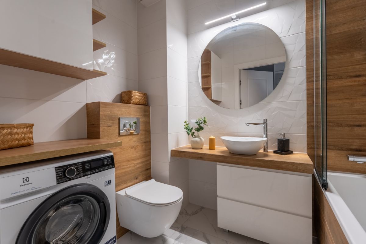 - Łazienka z wanną i licznymi szafkami do przechowywania