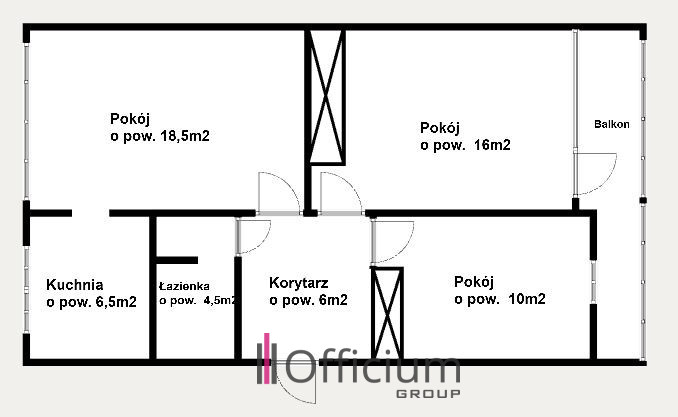 Lokal o pow. ok. 63 m² , składa się z: trzech oddzielnych pokoi (w tym: pokój dzienny (ok. 18,5 m²), pokój (ok. 16 m²) z wyjściem na balkon, pokój (ok. 10m²), oddzielnej kuchni z oknem, łazienki z wanną, korytarza z zabudowaną szafą wnękową.