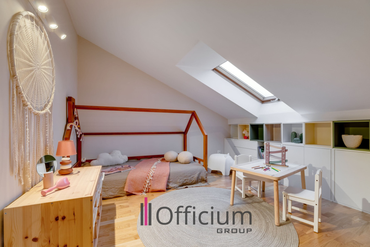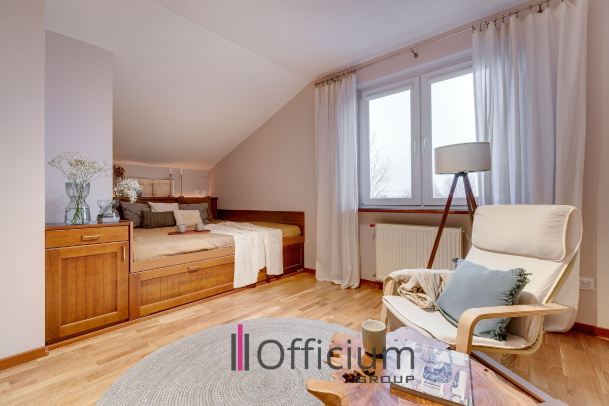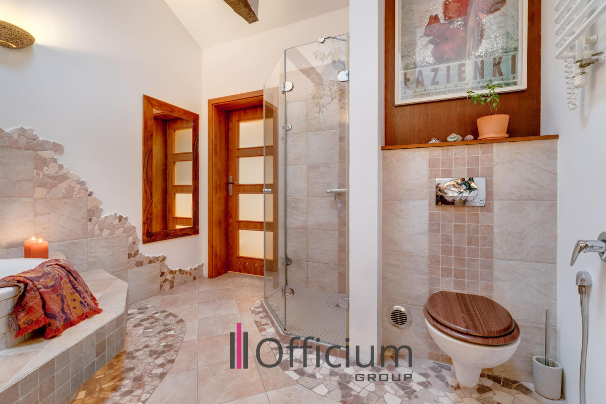Wyjątkowa i niezwykle imponująca łazienka na poddaszu wyposażona jest zarówno w kabinę prysznicową, jak i wannę. Dodatkowym atutem są dwie bardzo duże garderoby, które znacząco podnoszą funkcjonalność przestrzeni. Całość tworzy niezwykle wygodne i komfortowe miejsce do życia.