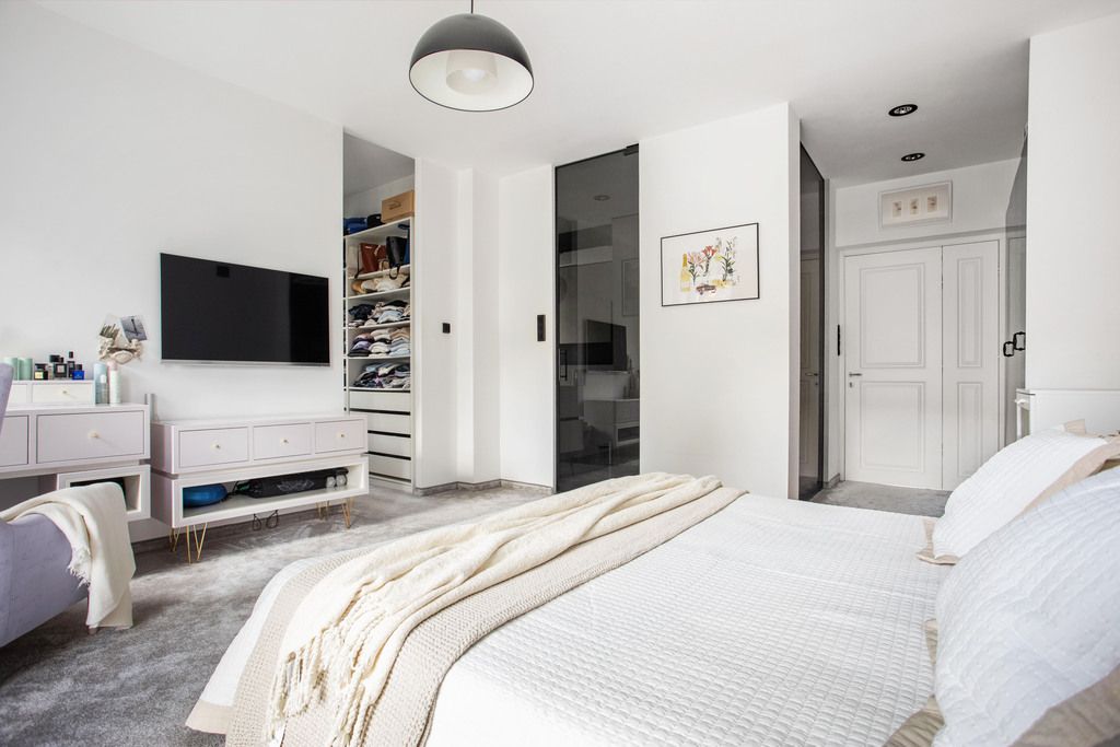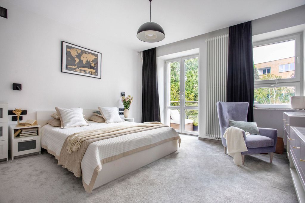 Główna sypialnia z własną garderobą, pokojem kąpielowym oraz wyjściem na balkon to prawdziwa oaza spokoju o poranku.
