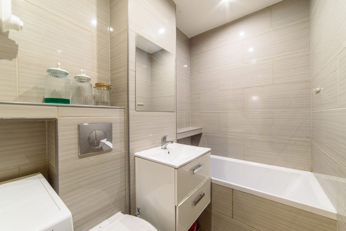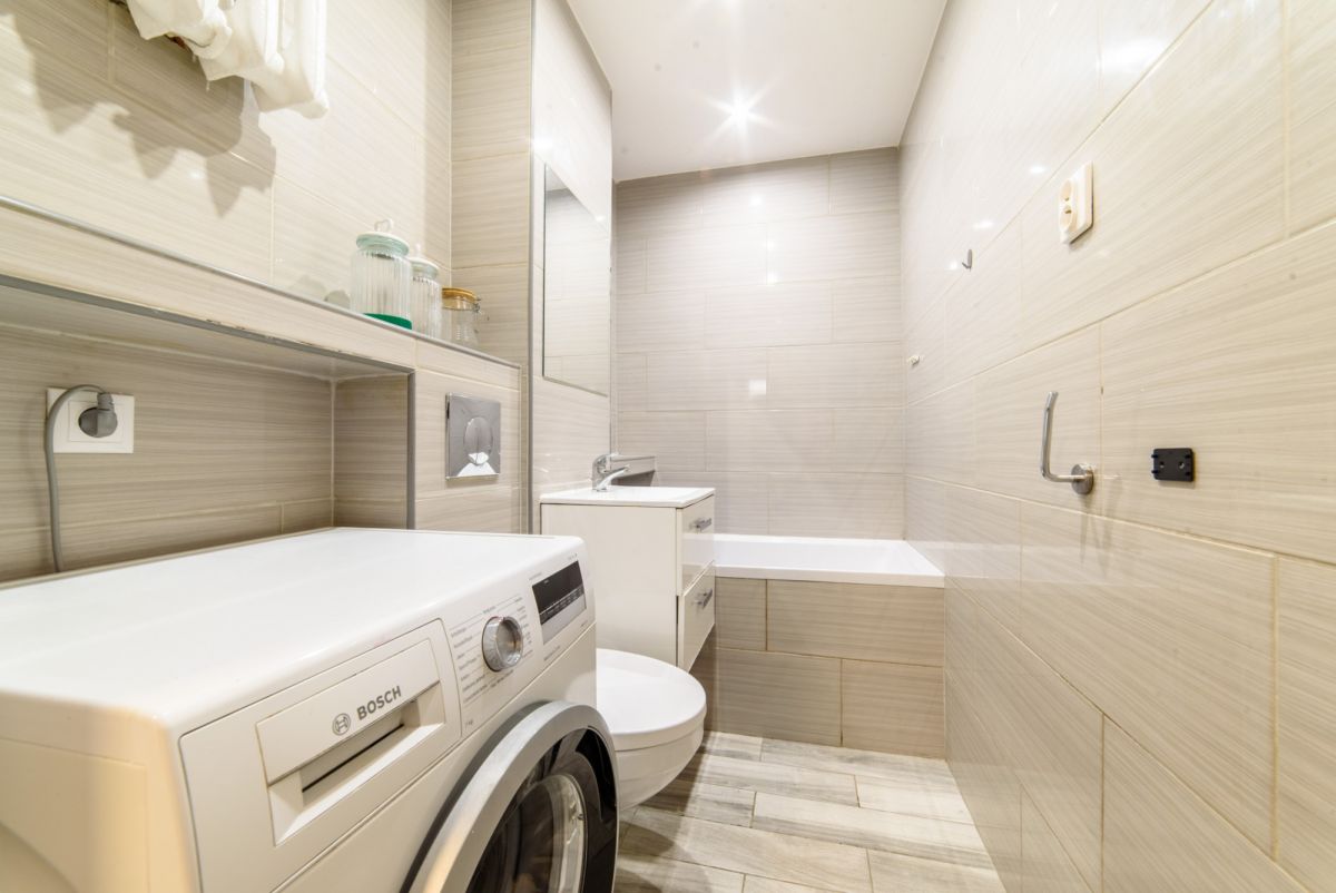 Łazienka z wanną i dużym lustrem oraz szafkami w zabudowie meblowej. W łazience zainstalowana pralka.