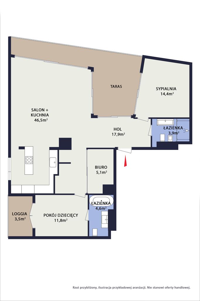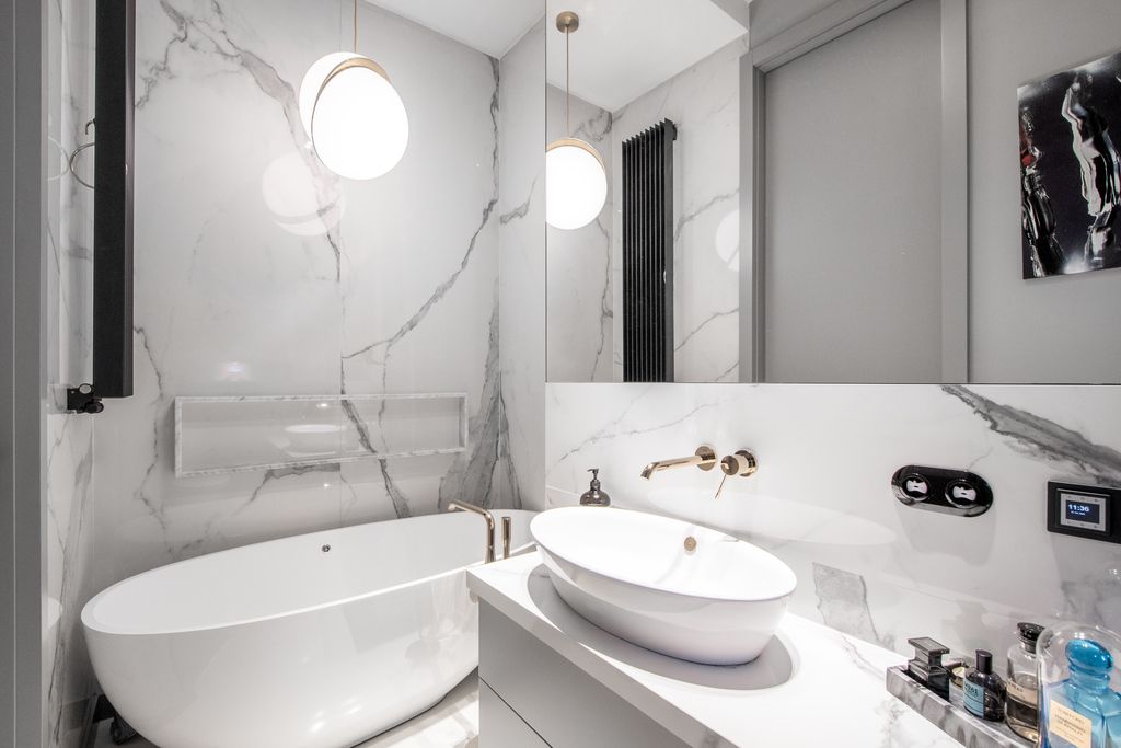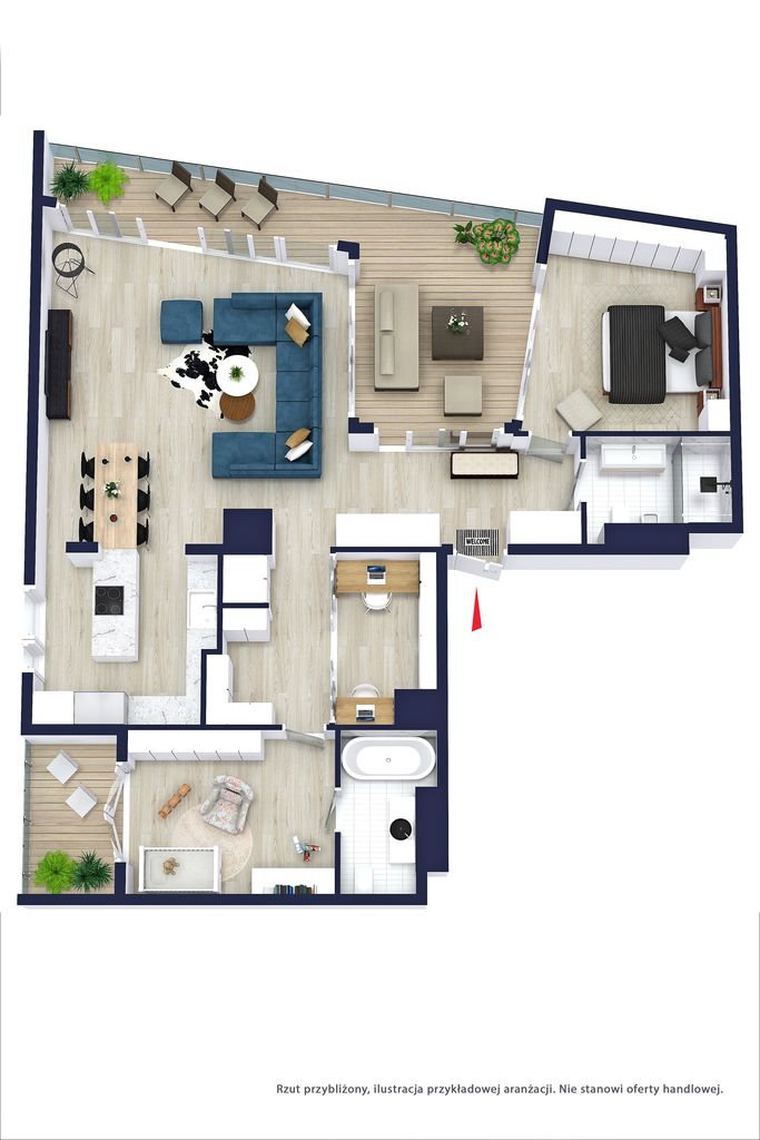 Przestronna część dzienna, wydzielona strefa do pracy zdalnej, dwie komfortowe sypialnie, dwie designerskie łazienki (jedna z wanną druga z prysznicem), profesjonalnie wyposażona kuchnia z wyspą do gotowania.