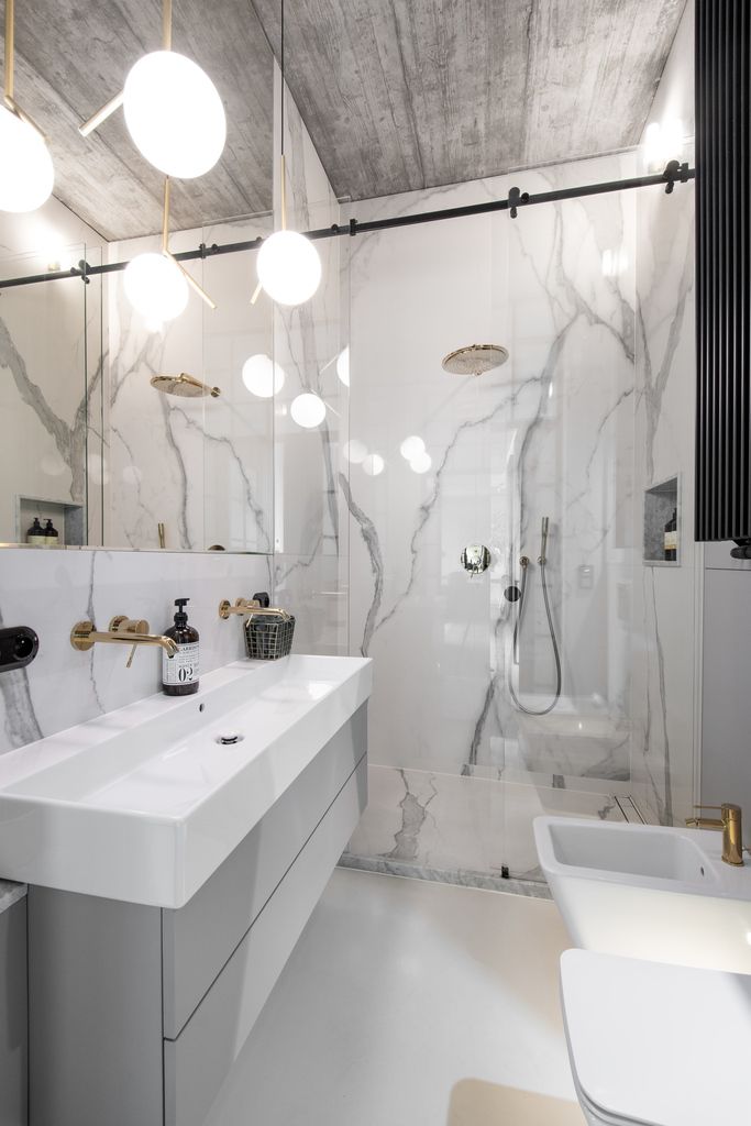 We present a magnificent Penthouse finished according to the original design using the highest quality materials, large-format sintered marble, oak parquet, custom made carpentry,custom 2.90 m tall doors and other stylish solutions. This modern apartment, well designed and furnished with class and taste, is offered fully equipped – ready to move in.
