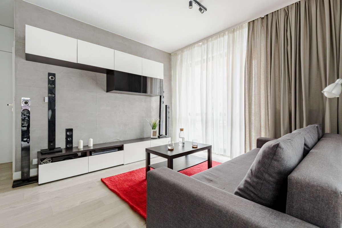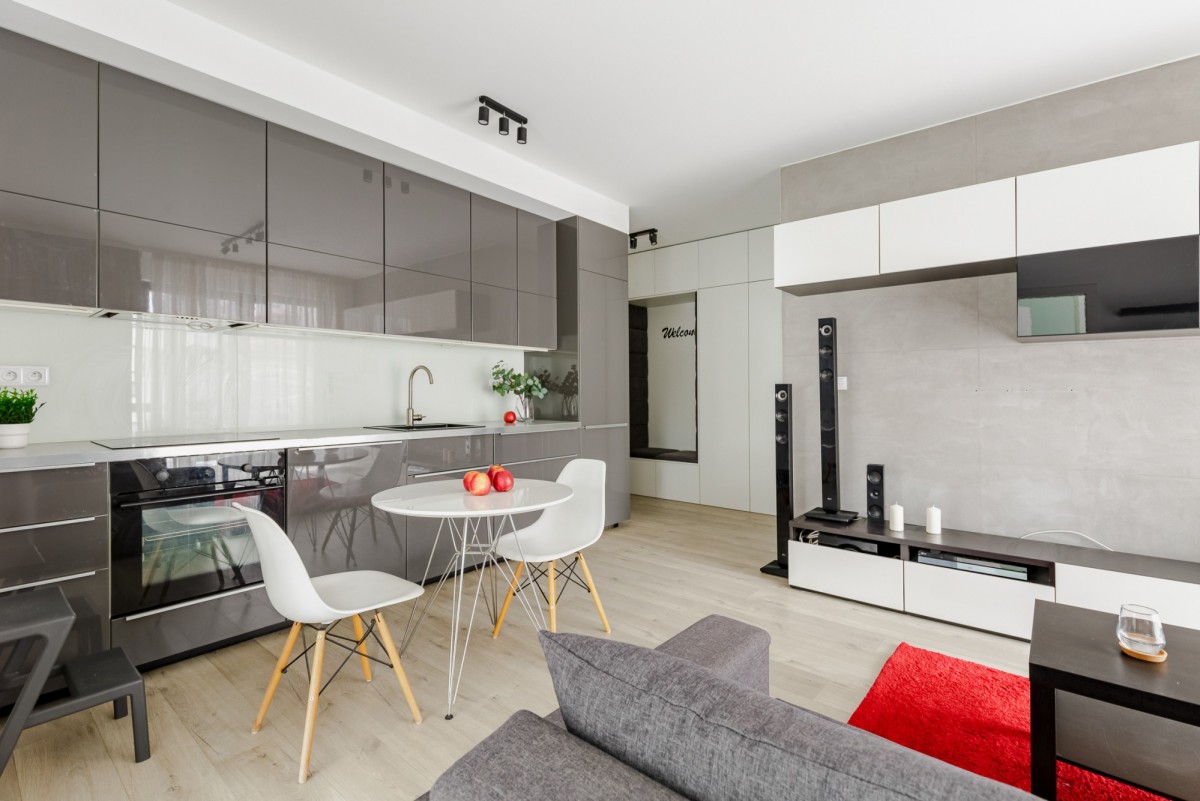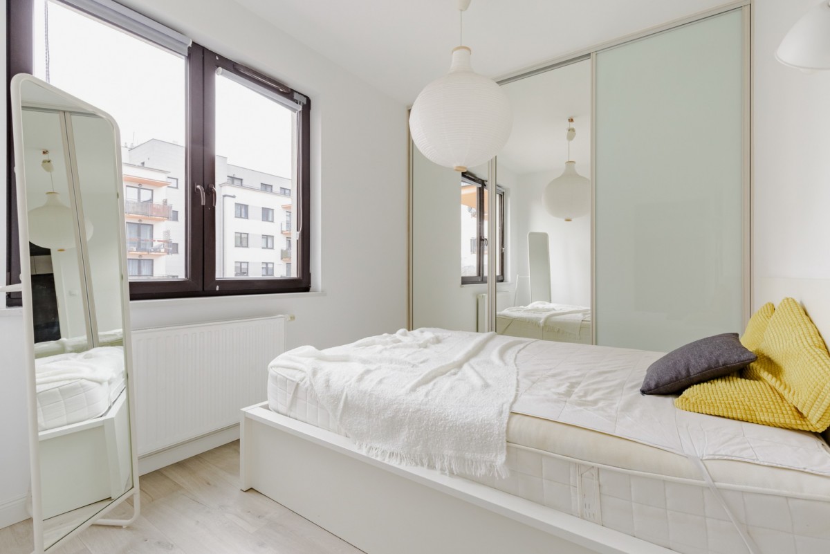 Mieszkanie zostało wykończone w wysokim standardzie, z dbałością o detale. Aneks kuchenny wyposażony jest w sprzęty AGD (lodówka, piekarnik, płyta indukcyjna, zmywarka). Duże okna zapewniają doskonałe doświetlenie pomieszczeń.