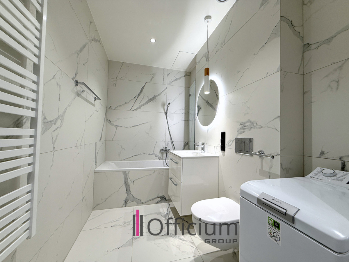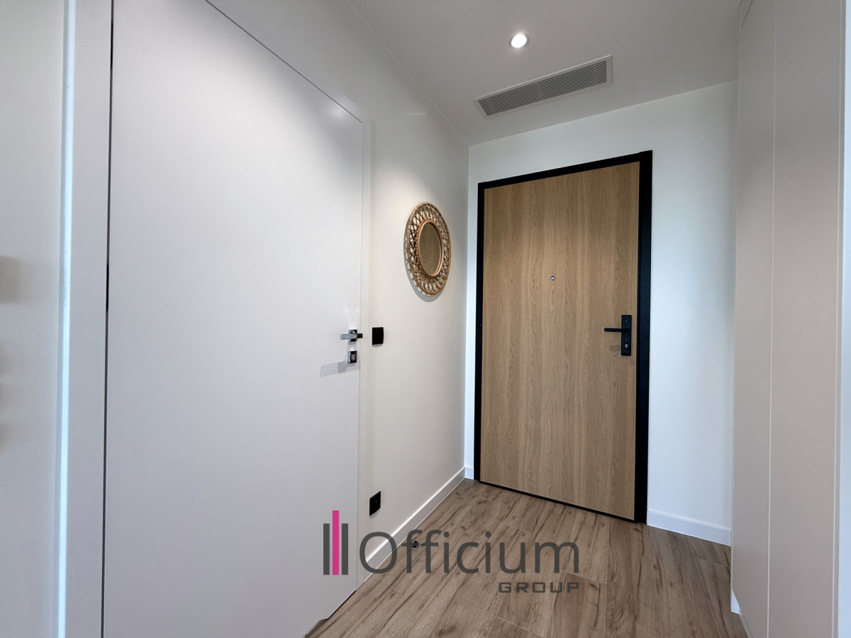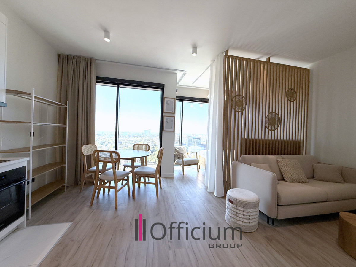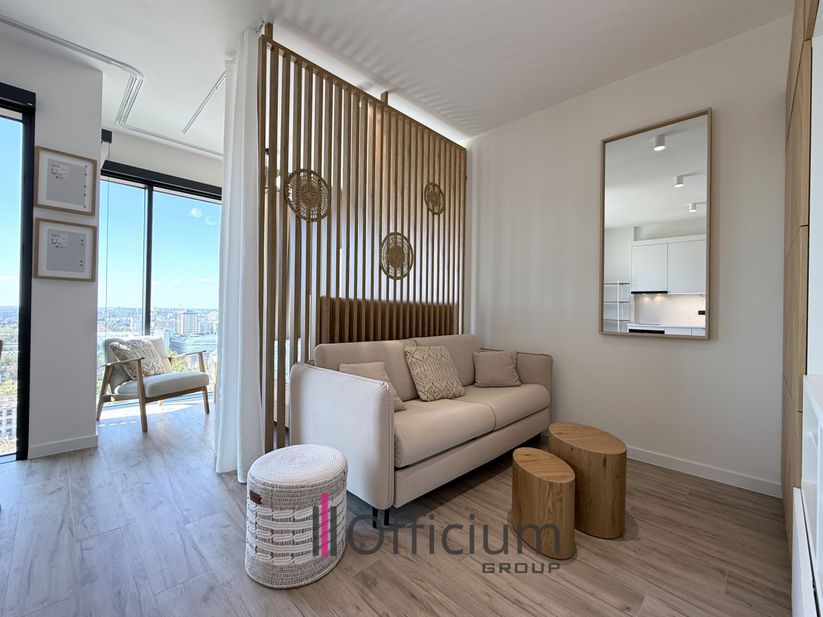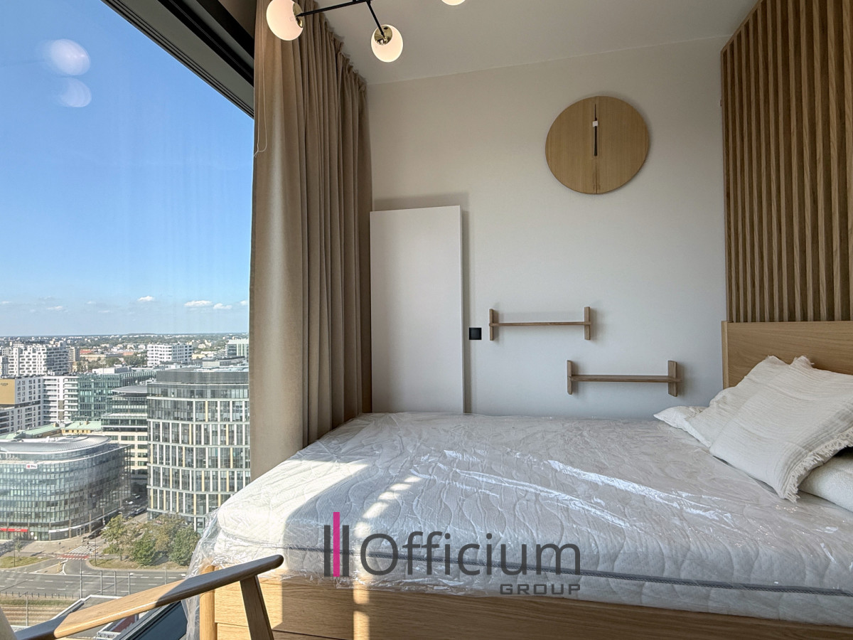 Przedmiotem najmu jest apartament o pow. 36 m2, usytuowany na 20 piętrze nowego budynku z 2025 roku. Osiedle strzeżone, recepcja całodobowa, wykończenia części wspólnych o podwyższonym standardzie. Apartament gustownie zaprojektowany i solidnie wykończony, składa się z: salonu z aneksem kuchennym z pełnym wyposażeniem AGD, sypialni, łazienki z wanną oraz przedpokoju z szafą w zabudowie. Duże okna zapewniają odpowiednie doświetlenie mieszkania.